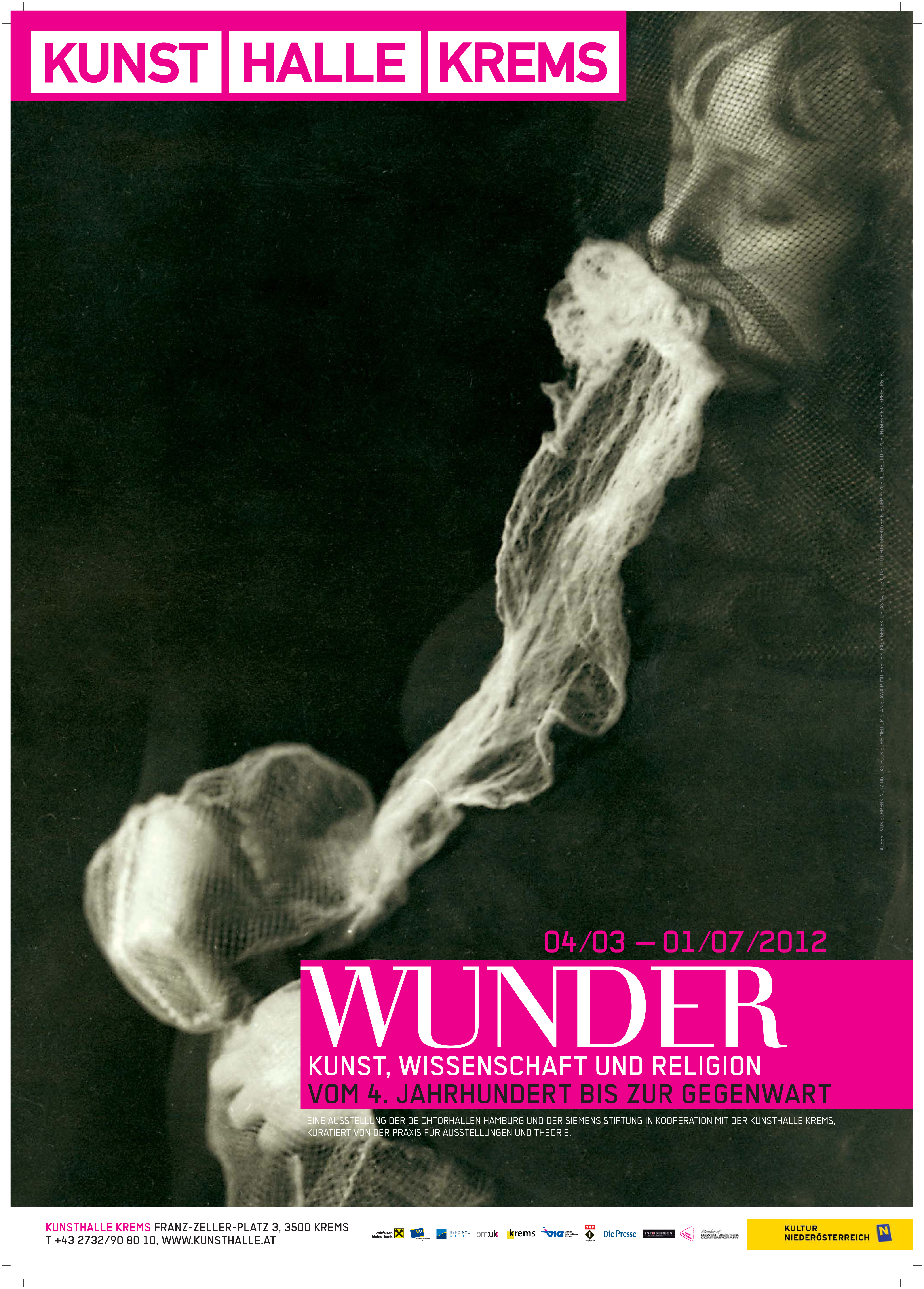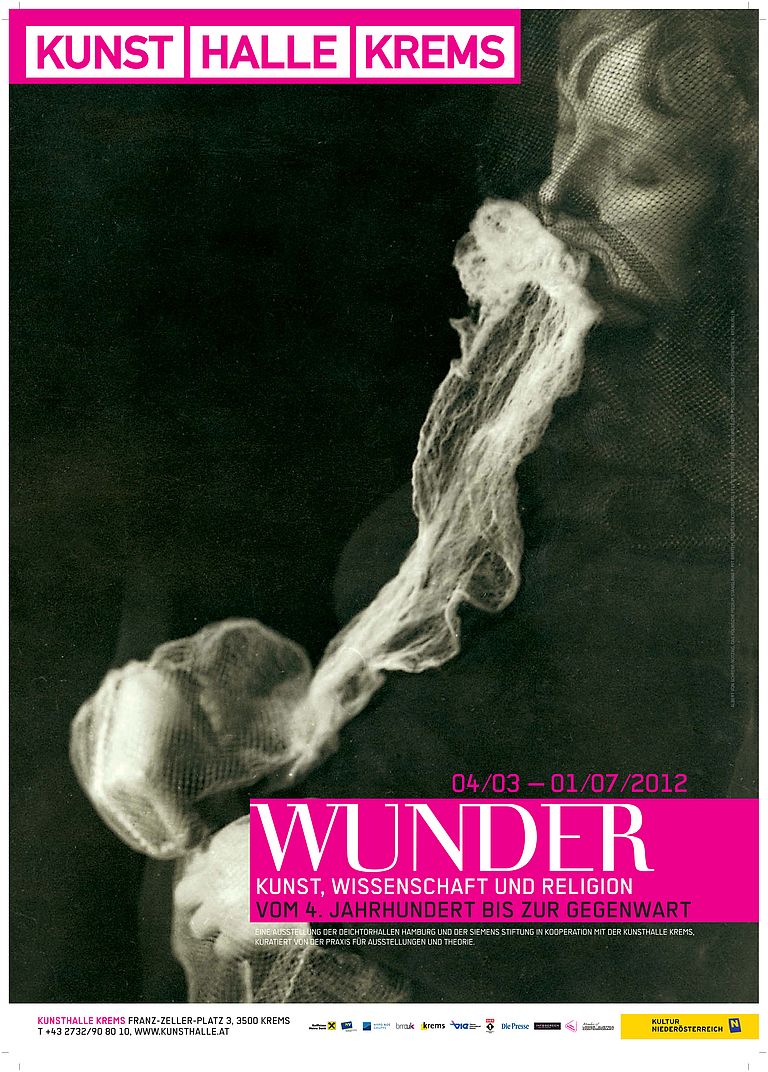 WUNDER ist ein Begriff, der die Grenzen sprengt. Diese Ausstellung macht sich sein explosives Potenzial zunutze und begibt sich – über Zeiten und Disziplinen hinweg – auf die Spur des Wunders. Künstlerische Exponate, zum Beispiel von von Francis Alÿs, Joseph Beuys, Dara Birnbaum, Jonathan Horowitz, Helmut & Johanna Kandl, Martin Kippenberger & Albert Oehlen, Terence Koh, Ingeborg Lüscher, Katharina Sieverding, Roman Signer, Thomas Struth, Franz West oder Erwin Wurm werden hier ebenso vielen Exponaten aus Religion, Wissenschaft und Alltag gegenüberstellt. Darunter befinden sich neben Votivbildern, Geisterhänden, Seligsprechungsakten, und Goethes Zauberkasten auch echte Tiefsee-Organismen. Sie wurden zur Verfügung gestellt vom GEOMAR | Helmholtz-Zentrum für Ozeanforschung Kiel. Die Organismen stehen für den größten Lebenraum der Erde, der uns Menschen immer noch so fremd ist, dass seine Bewohner uns wie Kreaturen einer anderen Welt erscheinen - eben wie ein Wunder.