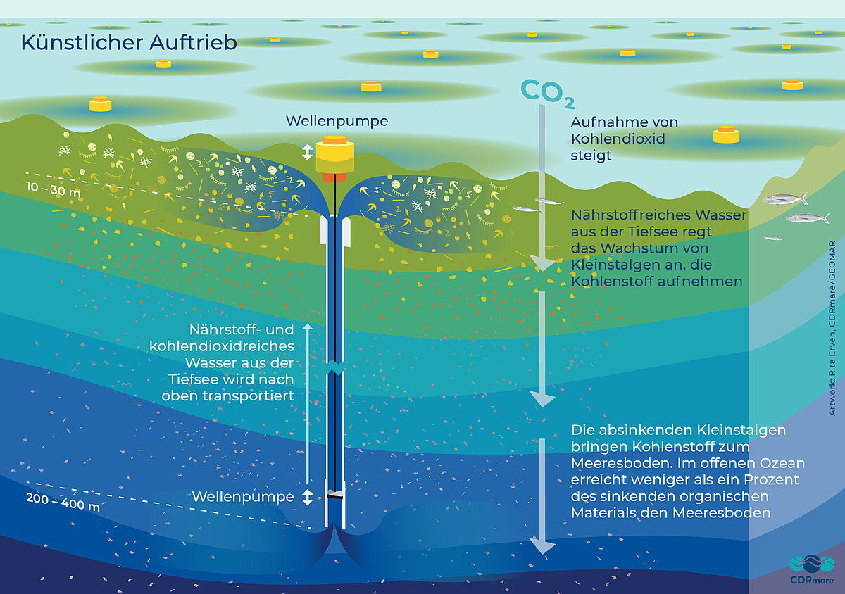 In weiten Teilen des Ozeans ist das Phytoplankton allerdings durch die Verfügbarkeit von Nährstoffen wie Stickstoff, Phosphor und Eisen eingeschränkt. Wenn man den Aufwärtstransport von nährstoffreichem Tiefenwasser durch künstlichen Auftrieb mit Hilfe von Rohren oder Wellenpumpen verstärkt, hat dies eine düngende Wirkung und kann die Gewässer der Ozeanwüsten produktiver machen. Durch das stimulierte Wachstum des Phytoplanktons kann mehr CO2 in dessen Biomasse gebunden werden, was die Kohlenstoffaufnahme des oberen Ozeans erhöht. Wenn das Phytoplankton stirbt und seine Biomasse in die Tiefsee sinkt, kann der gebundene Kohlenstoff in der Tiefe für 100 Jahre und mehr gespeichert werden. Wenn es technisch machbar, ökologisch akzeptabel und wirtschaftlich tragfähig ist, könnte der Einsatz von künstlichem Auftrieb auch für die ökosystembasierte Fischzucht einen wichtigen Beitrag zu einer ökologisch nachhaltigen marinen Aquakultur leisten.