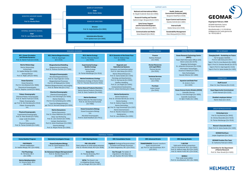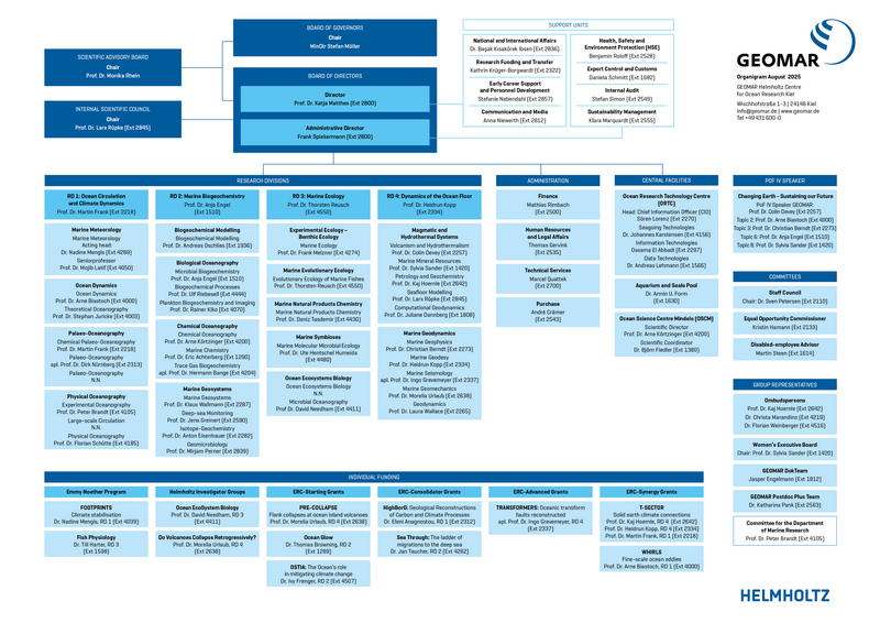 The institute has four major research divisions: Ocean Circulation and Climate Dynamics, Marine Biogeochemistry, Marine Ecology and Dynamics of the Ocean Floor as well as some central infrastructure and service units.