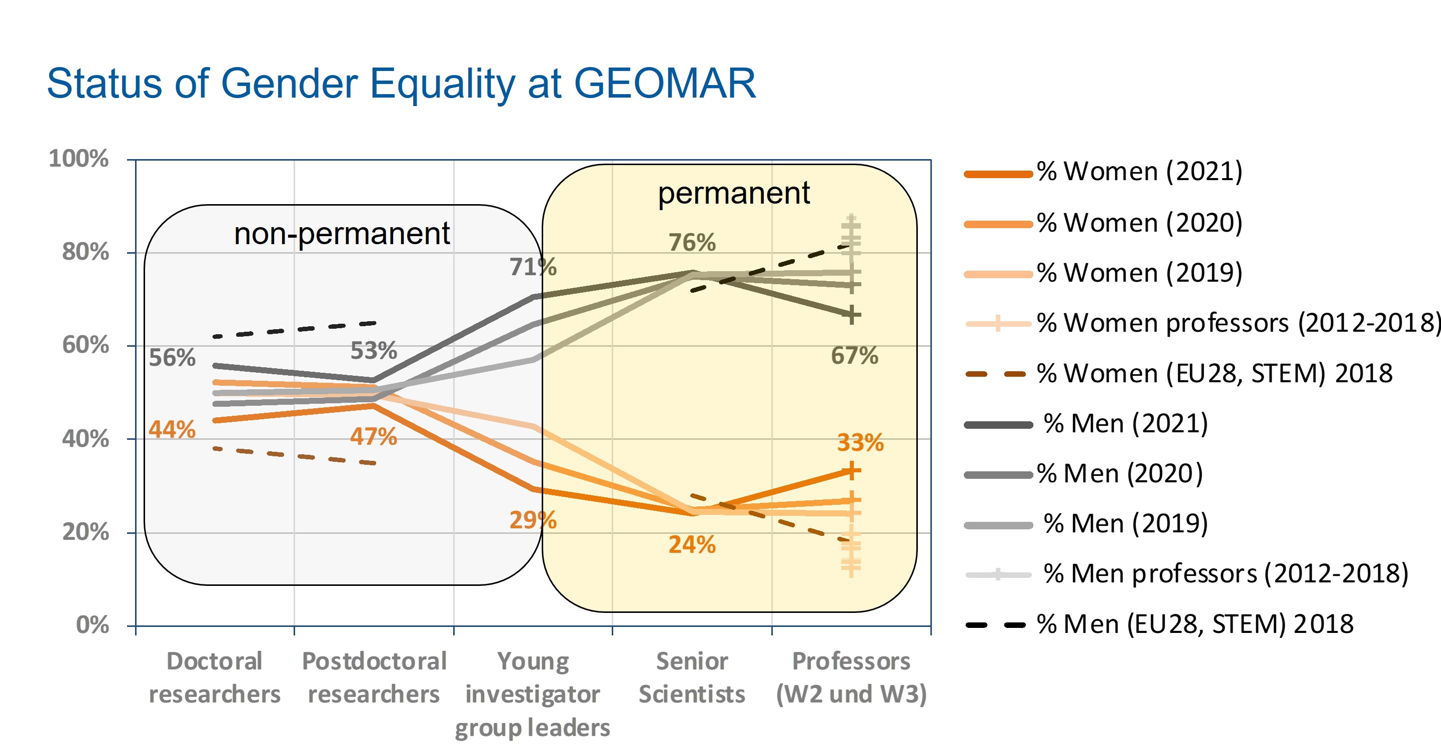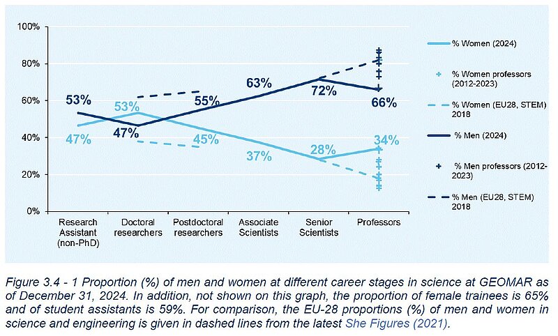 Currently, GEOMAR has a balanced gender ratio in the career levels of PhD, non-permanent postdoctoral researchers (postdocs). As in other science institutions and universities, this percentage decreases significantly in permanent positions of researchers (28%) and W2/W3 professors (34%) (Status: 12.2024).