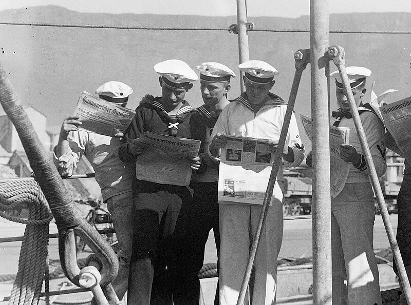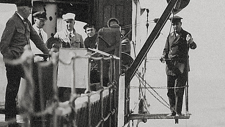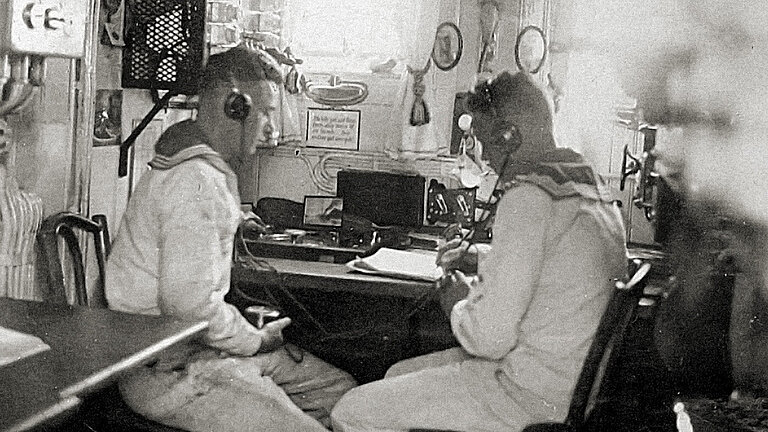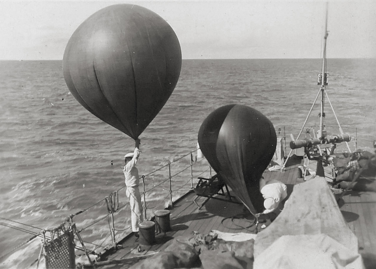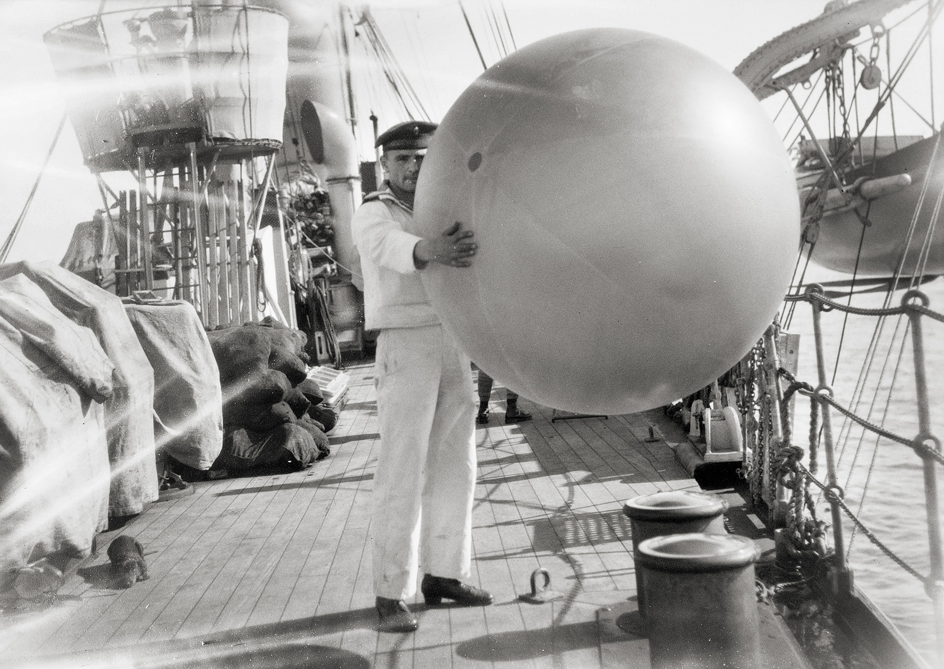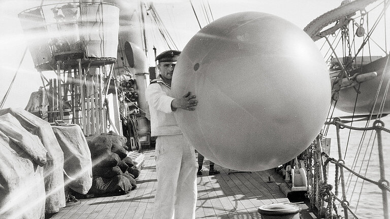 03.02.27: "We are conducting a registration balloon ascent. The first balloon bursts prematurely after about 20 minutes at an altitude of approximately 5000 metres. The signal balloon is continuously tracked and located, but also bursts prematurely, so that after 45 minutes we have to run at full speed to reach the spot where the envelope and instrument are floating in the water. We get it a little later than the estimated time, and the signal man Spiekermann in the foremast receives the 10 Reichsmark reward on his birthday, of all days. The meteorologists attribute the premature bursting of the balloon to the intense heat, which causes the balloons to expand too quickly. At least the instrument reached an altitude of 4780 metres."
