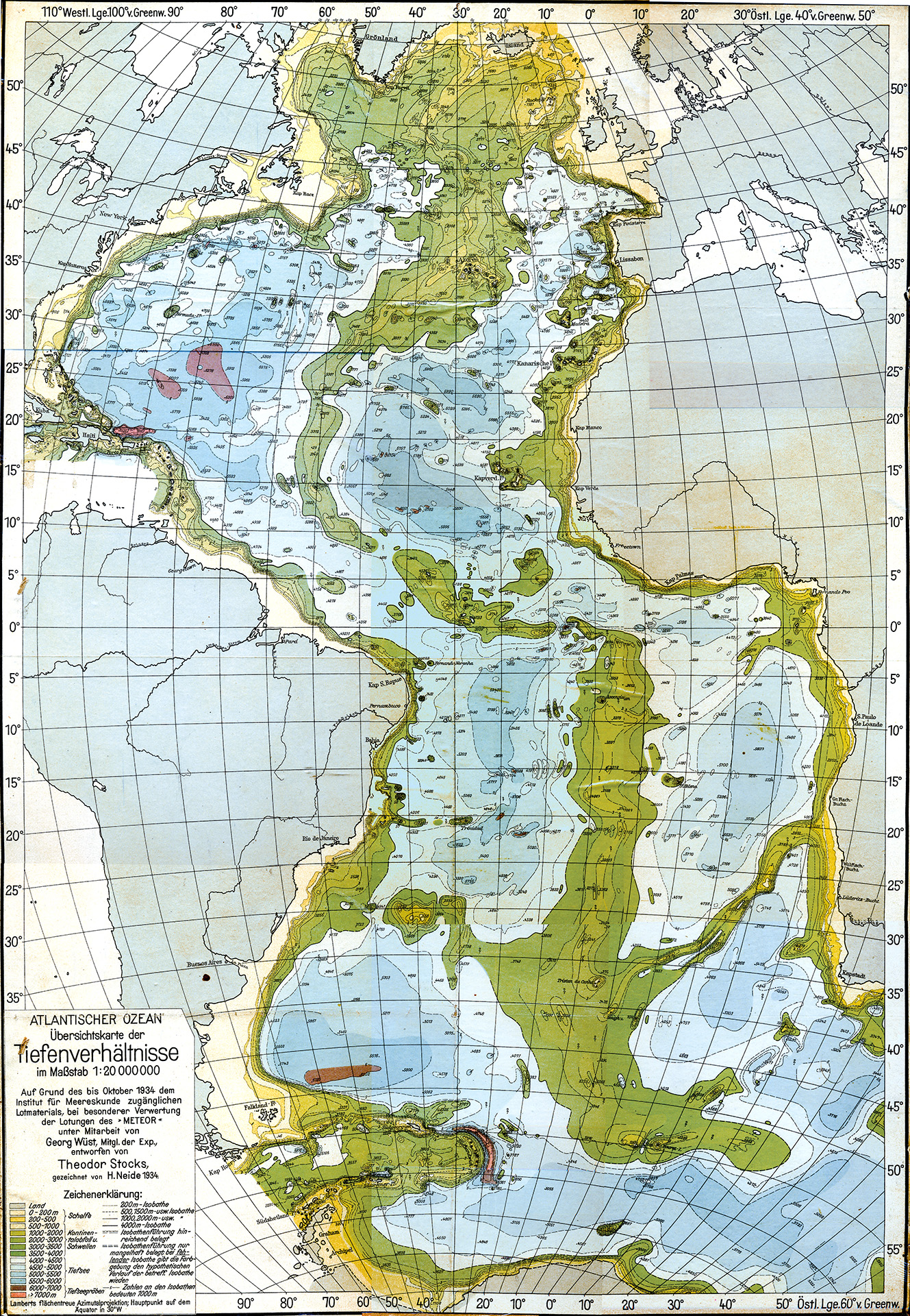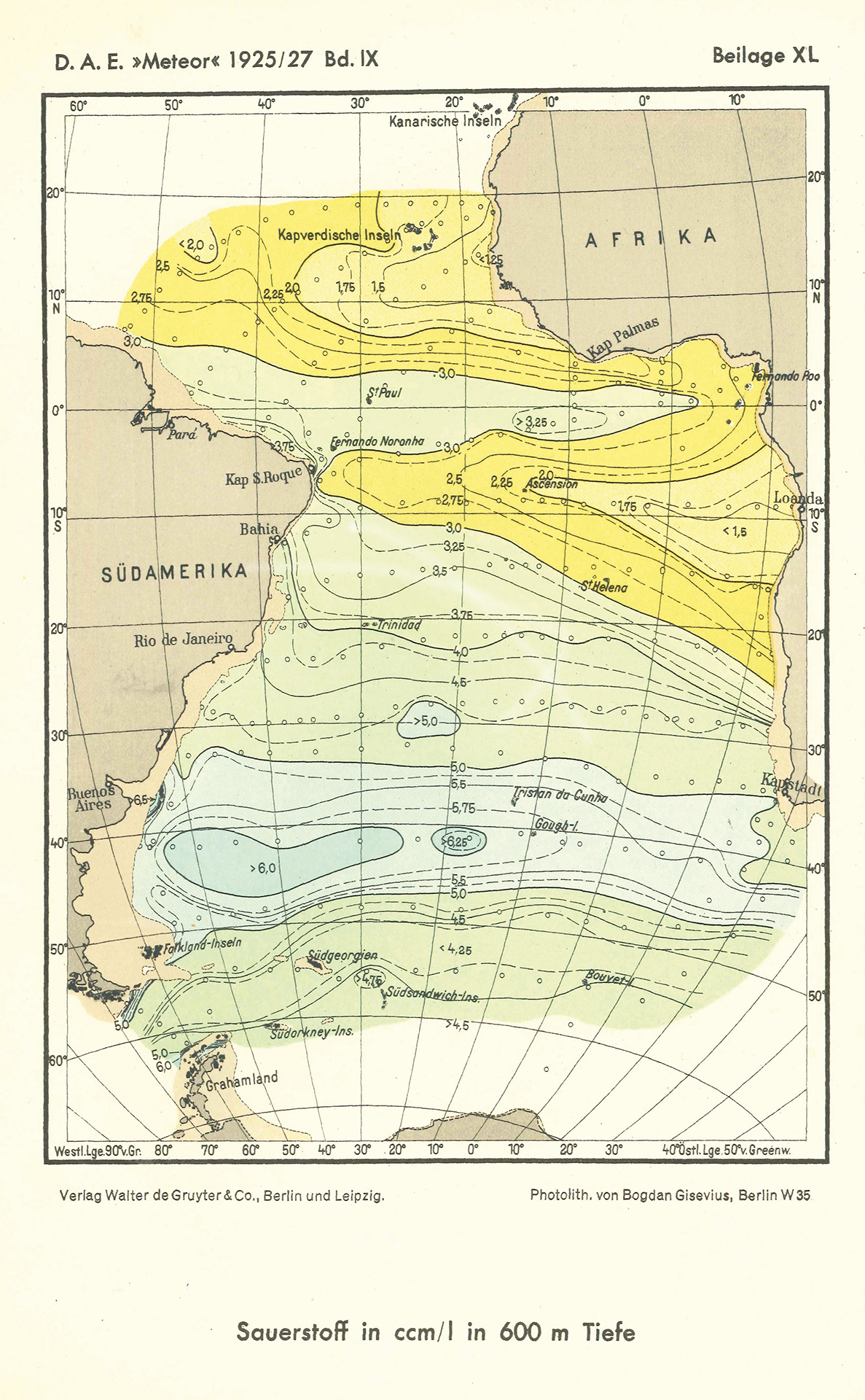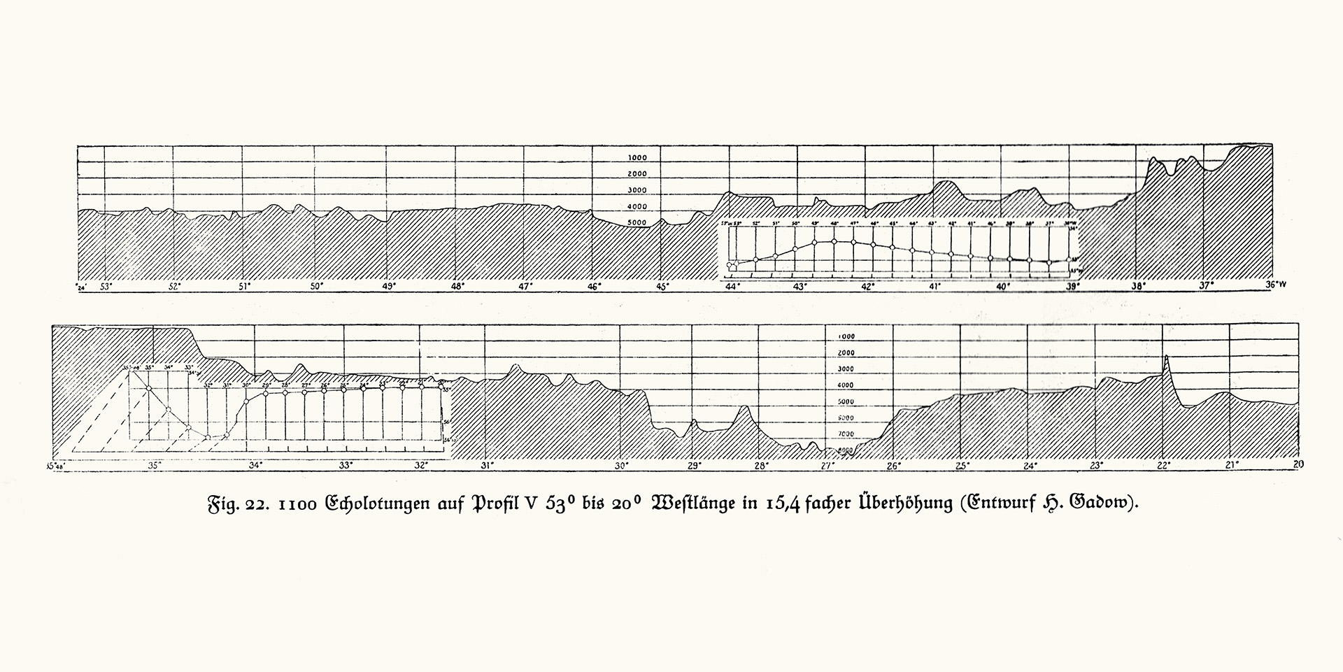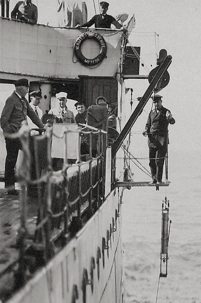 The German Atlantic Expedition (Deutsche Atlantische Expedition, DAE) produced impressive scientific results. More than 67,000 echo sounder measurements that were collected systematically greatly improved knowledge of the depths of the South Atlantic. The resulting higher-resolution image of the sea floor clearly showed the Mid-Atlantic Ridge for the first time. New shallows were discovered and, in some cases, named for the first time. At more than 300 stations, the researchers carried out chemical, physical and biological investigations, accompanied by atmospheric measurement series. This comprehensive research method marked the transition from purely descriptive marine science to analytical oceanography as it is practised today. Among other aspects, it enabled the detection of water exchange between the current systems of the northern and southern hemispheres.
