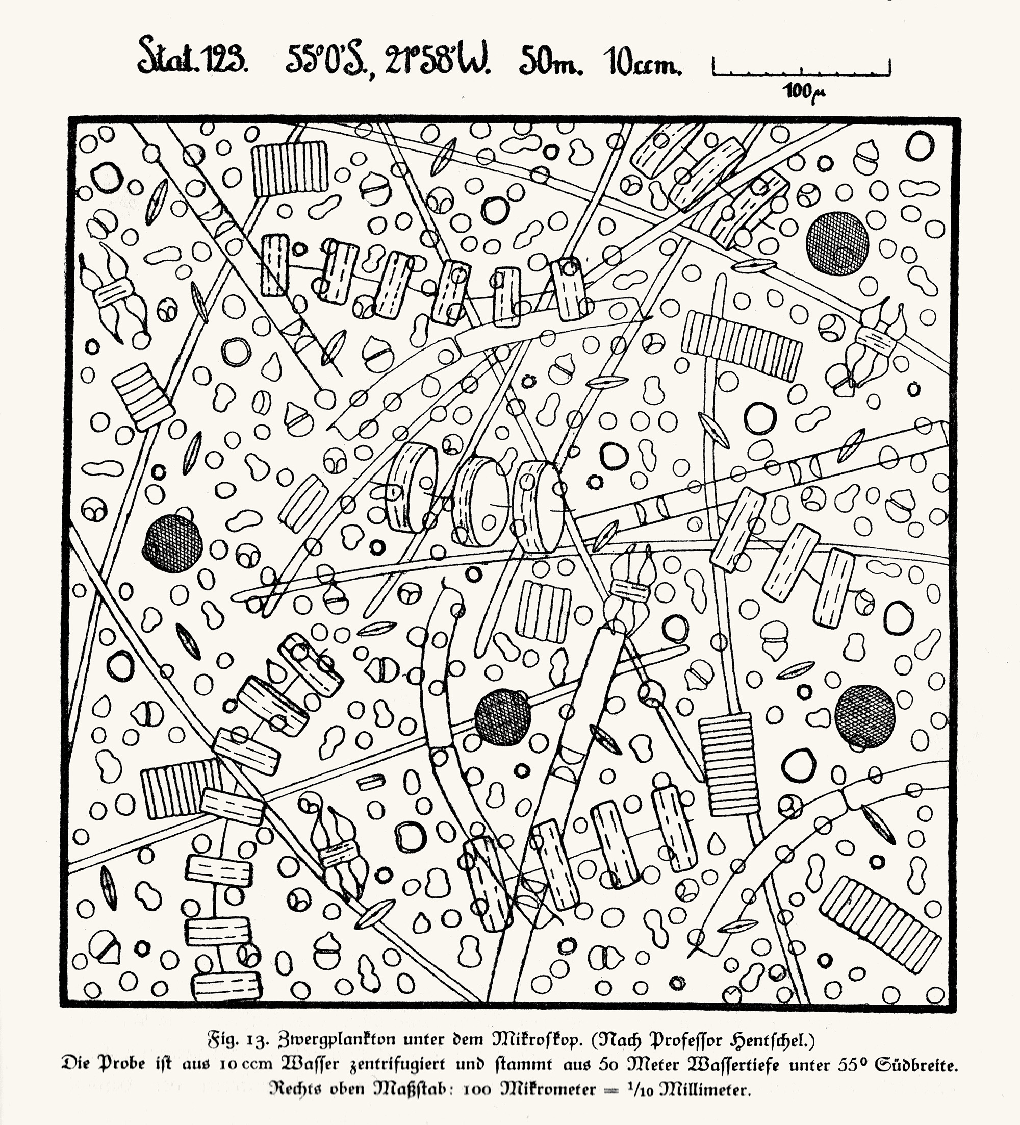 "At the beginning of our expedition, the lightless deep sea was, in the truest sense of the word, mare incognitum for quantitative plankton research. We have now established that in the area of our first three profiles, the water at all depths is still so densely populated with nannoplankton that in little more than half a litre (540 cm³) of water, almost without exception, a few organisms can still be found. This deep-sea plankton is not only an impoverished version of the upper layer plankton, but is also somewhat characteristic..."