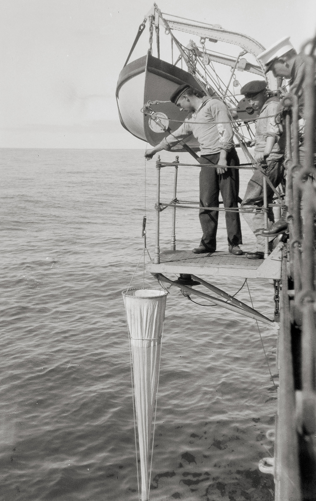 The equipment used includes the Apstein Net (to a depth of 200 metres) and the Nansen Closing Net (from 1000 to 700 metres and from 500 to 200 metres) for collecting, identifying and counting larger plankton species, and the Secchi Disc ("white disc") for determining visibility depth. For the quantitative recording of nanoplankton, smaller quantities of water (100 and 540 millilitres), which are obtained from various depths using water samplers, centrifuged and then counted "while still alive" under the microscope. Further information was obtained by sedimentation of water samples and the filtration of seawater from the deck wash pump.