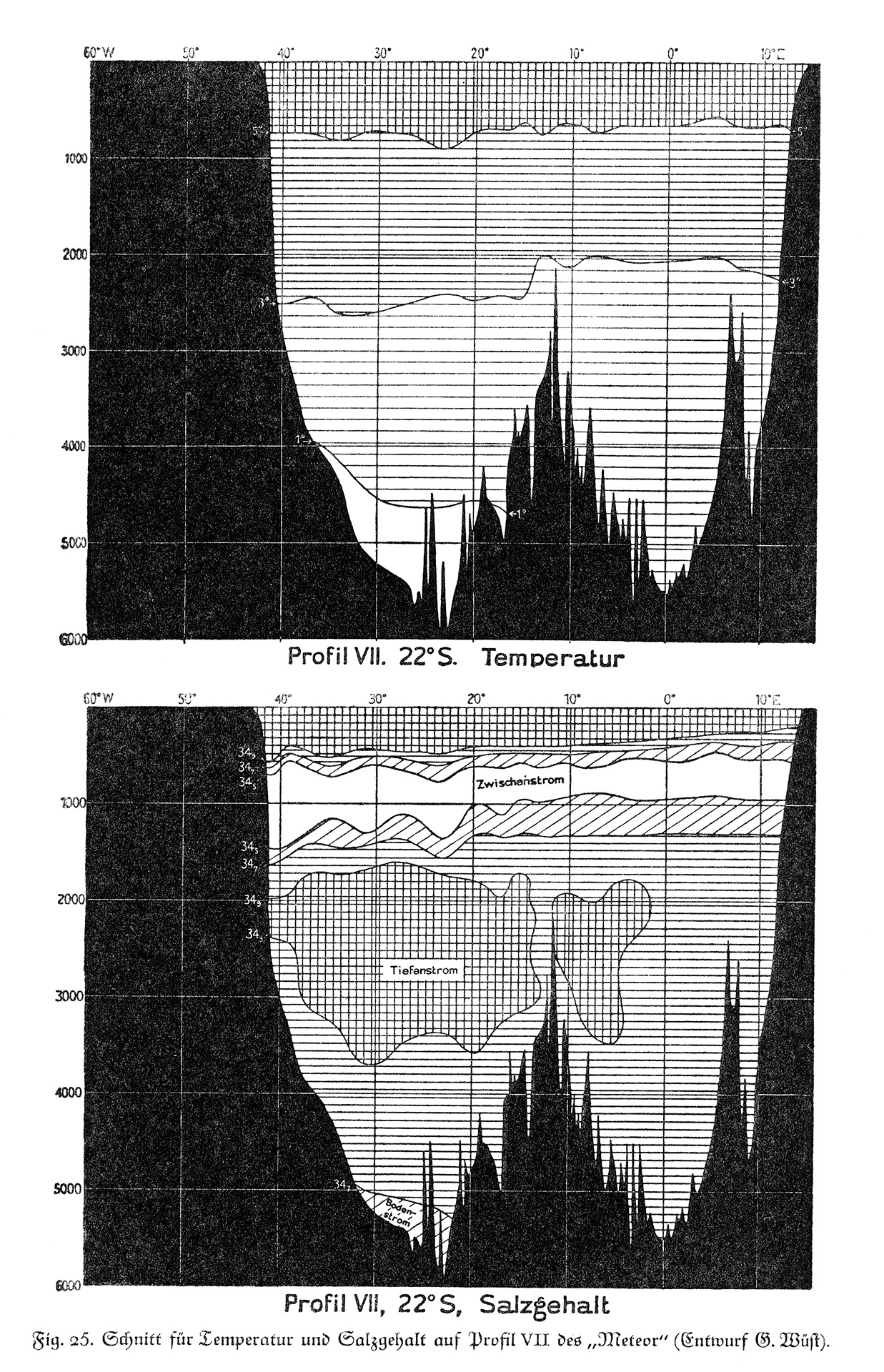Alfred Merz defined the recording of vertical currents (mixing), a new topic in marine research at the time, as one of the central tasks of the expedition in addition to (horizontal) ocean circulation. This is discussed in detail in the expedition report, "Report on the oceanographic investigations (Observers: Dr Böhnecke, Dr Meyer, Dr Schumacher, Dr Wüst)":