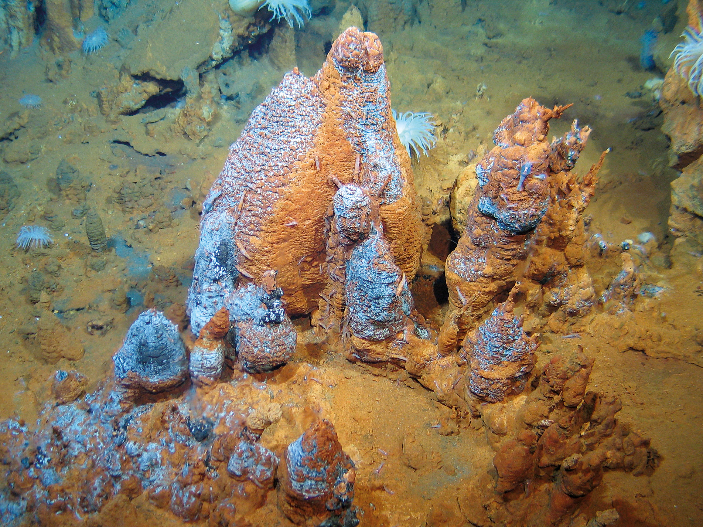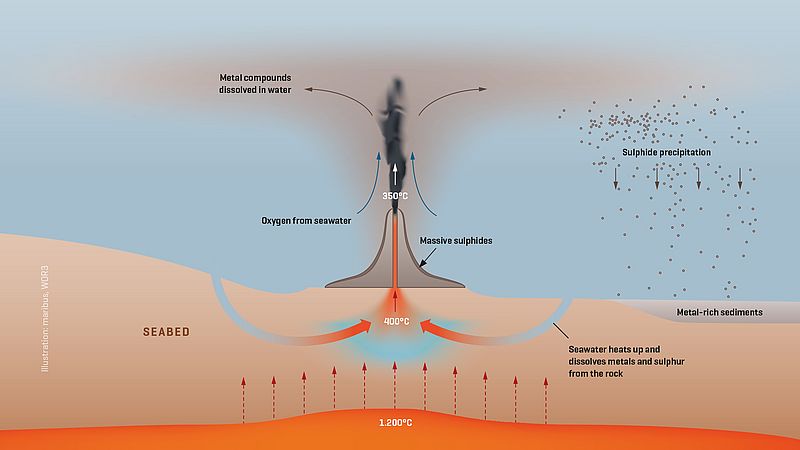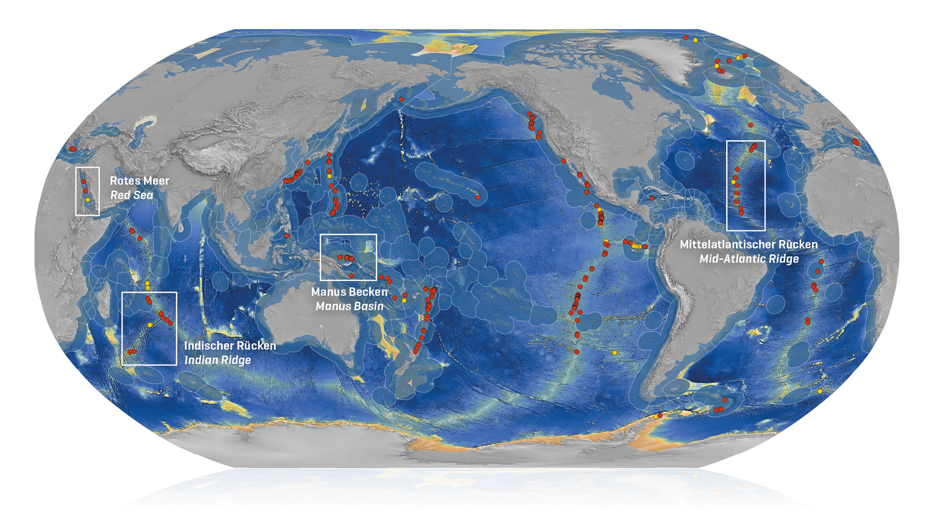 In 1979, the American research submarine Alvin dived into the Pacific Ocean. Through the small portholes of the pressurized hull, the crew saw meter-high chimneys on the seabed at a depth of around 2,600 meters, from which apparently black clouds of smoke were expelled. The scientists had discovered the first hydrothermal vents, so-called “Black Smokers”. Investigations showed that minerals were deposited around the springs, forming deposits of so-called massive sulphides. In the meantime, more than 410 occurrences are known in all oceans, although there are enormous differences in the size of these features. Hydrothermal vents are not only a source of raw materials, but also an extraordinary habitat.