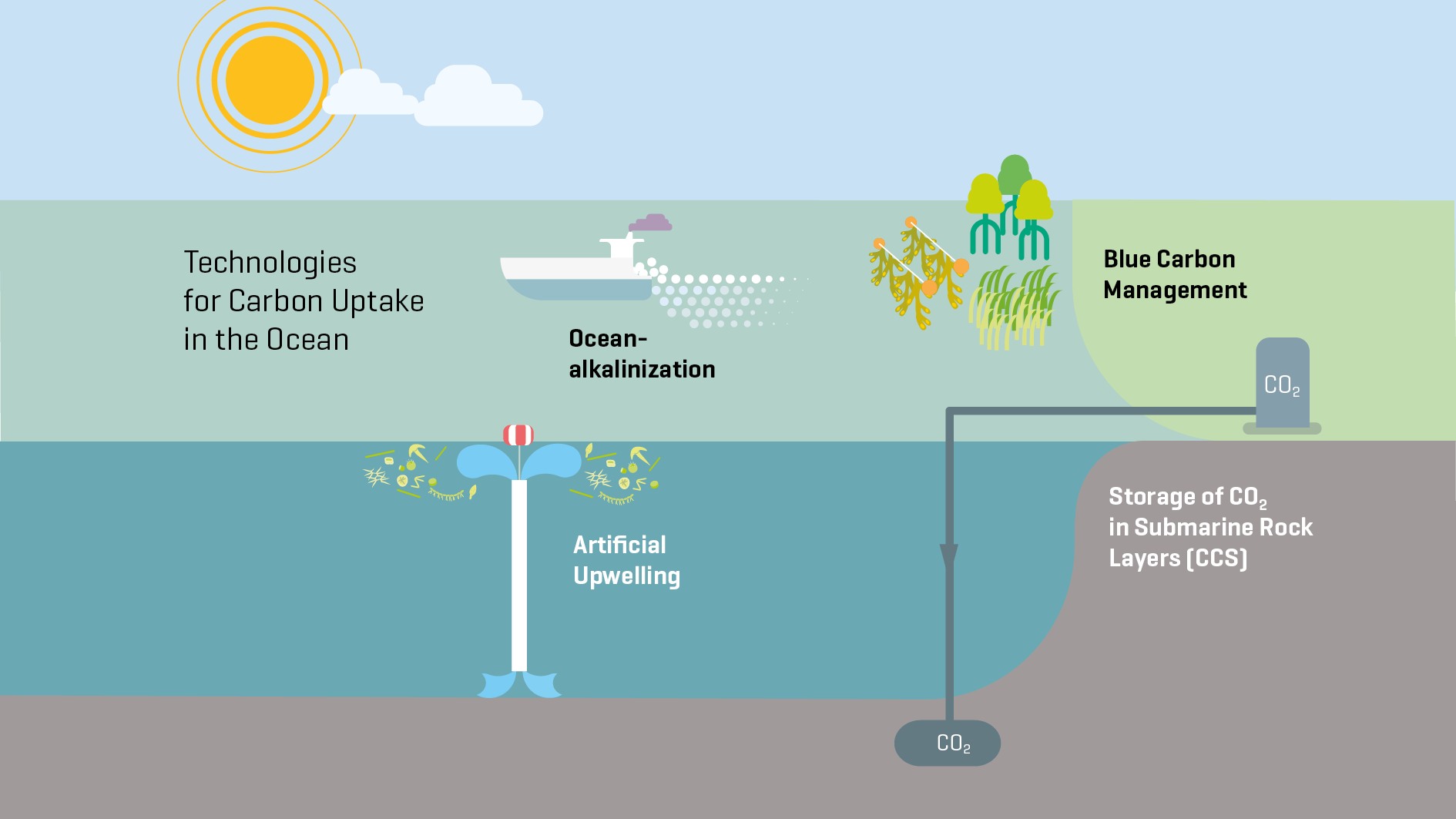 According to current calculations, between 350 and 780 billion tons of carbon dioxide would have to be removed from the atmosphere by 2100 in order to achieve the promised climate targets. Various methods are being discussed here, with the focus increasingly on the ocean. Various measures could be taken to increase the uptake of carbon dioxide from the atmosphere into the ocean in the future. These include the storage of CO2 in submarine rock layers (CCS) or near-natural measures through the restoration of carbon-storing coastal ecosystems (blue carbon management), the enhancement of chemical CO2 uptake and sequestration through ocean alkalinity enhancement, or even artificial ocean upwelling.