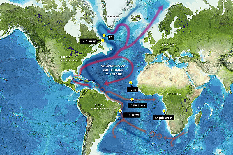 In the central Atlantic Ocean, GEOMAR operates a mooring in cooperation with the international PIRATA program to record the current systems along the equator. The mooring time series, which was started in 2001, contributes significantly to a better understanding of climate variations in the tropics and their predictability. This mooring has provided evidence of both approximately five-year variations in the deep ocean and ten-year changes in the surface circulation.