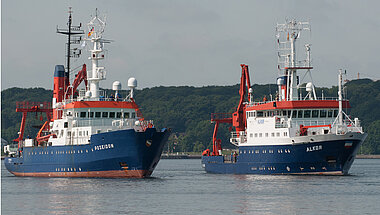 GEOMAR's large research vessels side by side on the Kiel Fjord - such a sight maybe never occured before. On 17 July 2013, ALKOR and POSEIDON sailed from the westshore pier to Holtenau together. ALKOR departed for western Sweden to recover the KOSMOS mesocosms after completing the long-term experiment on ocean acidification. POSEIDON had returned from a cruise to Norway, during which the research submersible JAGO examined and sampled cold-water corals.