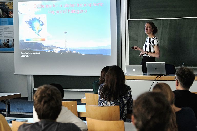 06 June 2019/Kiel. Marine derived halogen compounds containing chlorine, bromine, and iodine impact both tropospheric and stratospheric chemistry, mainly as ozone depleting substances. Dr. Lucy Carpenter, Professor of Physical and Atmospheric Chemistry at the University of York, investigates the controls and mechanisms responsible for their oceanic release. Today, Prof. Dr. Lucy Carpenter discussed the pervasive impact halogens have on atmospheric chemistry across the world’s oceans as part of the Marie Tharp Lecture Series at GEOMAR. In her lecture, she focused on iodine chemistry, for which the main source to the atmosphere is believed to be marine inorganic iodine. Prof. Carpenter presented advances in understanding the chemistry and exchange of halogenated gases and the subsequent, potentially changing, impacts on the atmosphere.