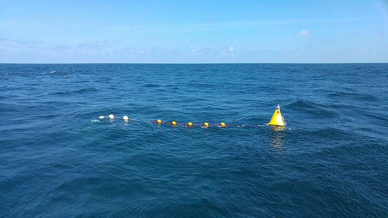 Drifting sediment trap with surface floats and buoy in the Humboldt Current off Peru. GPS/iridium devices and flashlights are attached to the surface buoy to help locate and retrieve the trap after deployment. Photo: Jon Roa, GEOMAR