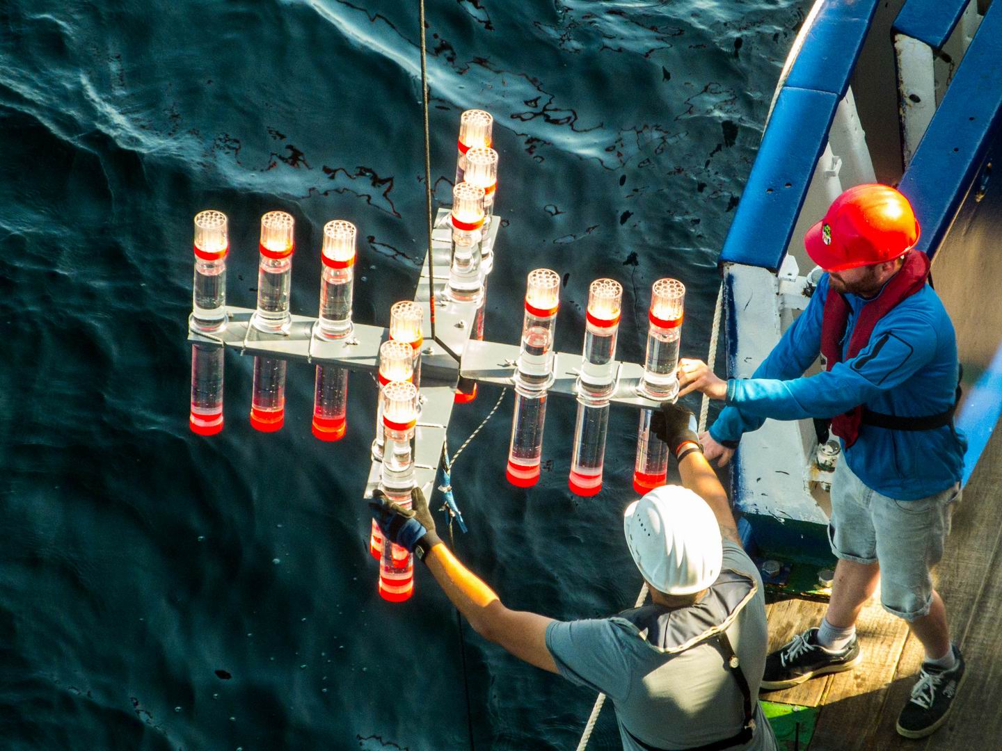 Deployment of the sediment trap on board the research vessel METEOR. Photo: Jon Roa, GEOMAR