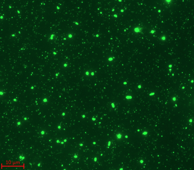Fluorescence microscopy image of marine microbial life stained with a DNA-binding dye. The smallest dots are virus-like particles, which can reach concentrations of 1 to 100 million per milliliter of seawater.
