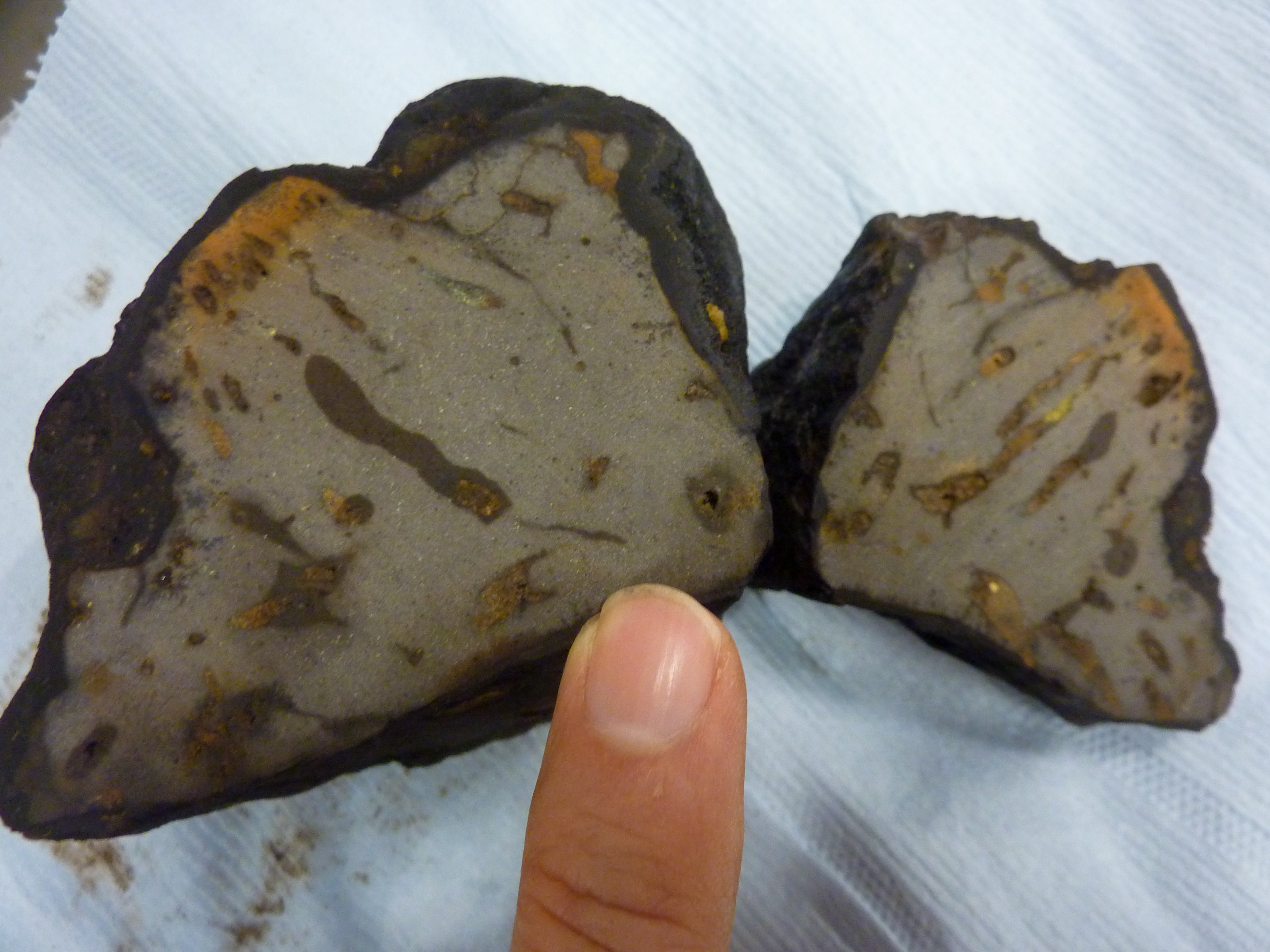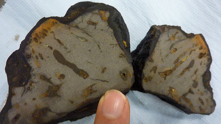 Section of basaltic volcanic rock: The elongated gas vesicles formed when gases from the magma escaped into the still liquid lava are clearly visible. The rock sample is covered by a thin crust of black manganese a few millimetres thick. Photo: Jörg Geldmacher, GEOMAR