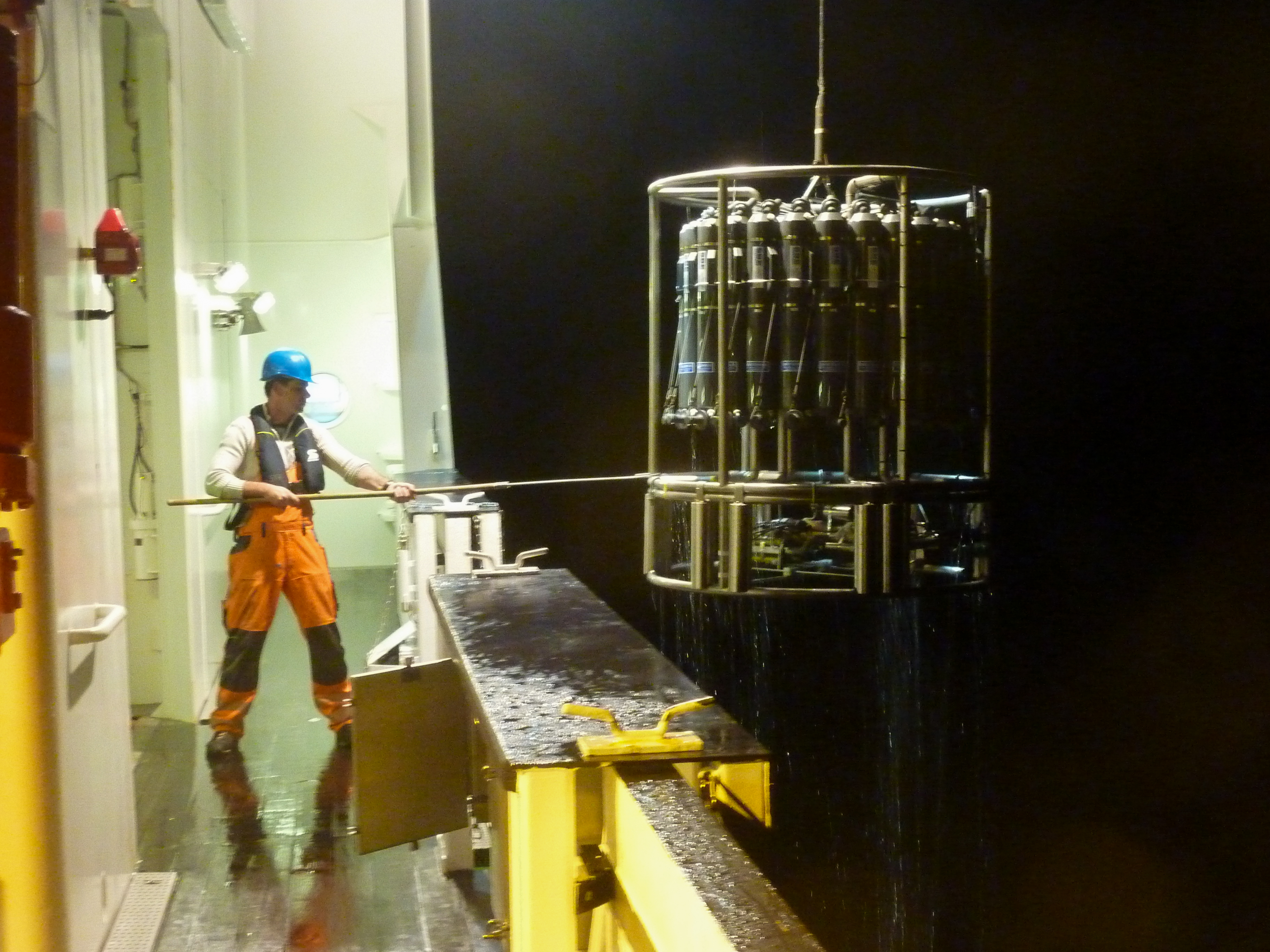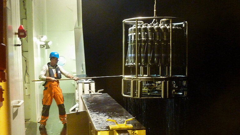 Night-time operation of the CTD rosette water sampler on the research vessel SONNE: The grey bottles collect water samples from different depths, while sensors in the lower part of the probe measure various oceanographic parameters such as temperature, conductivity and depth. Photo: Jörg Geldmacher, GEOMAR
