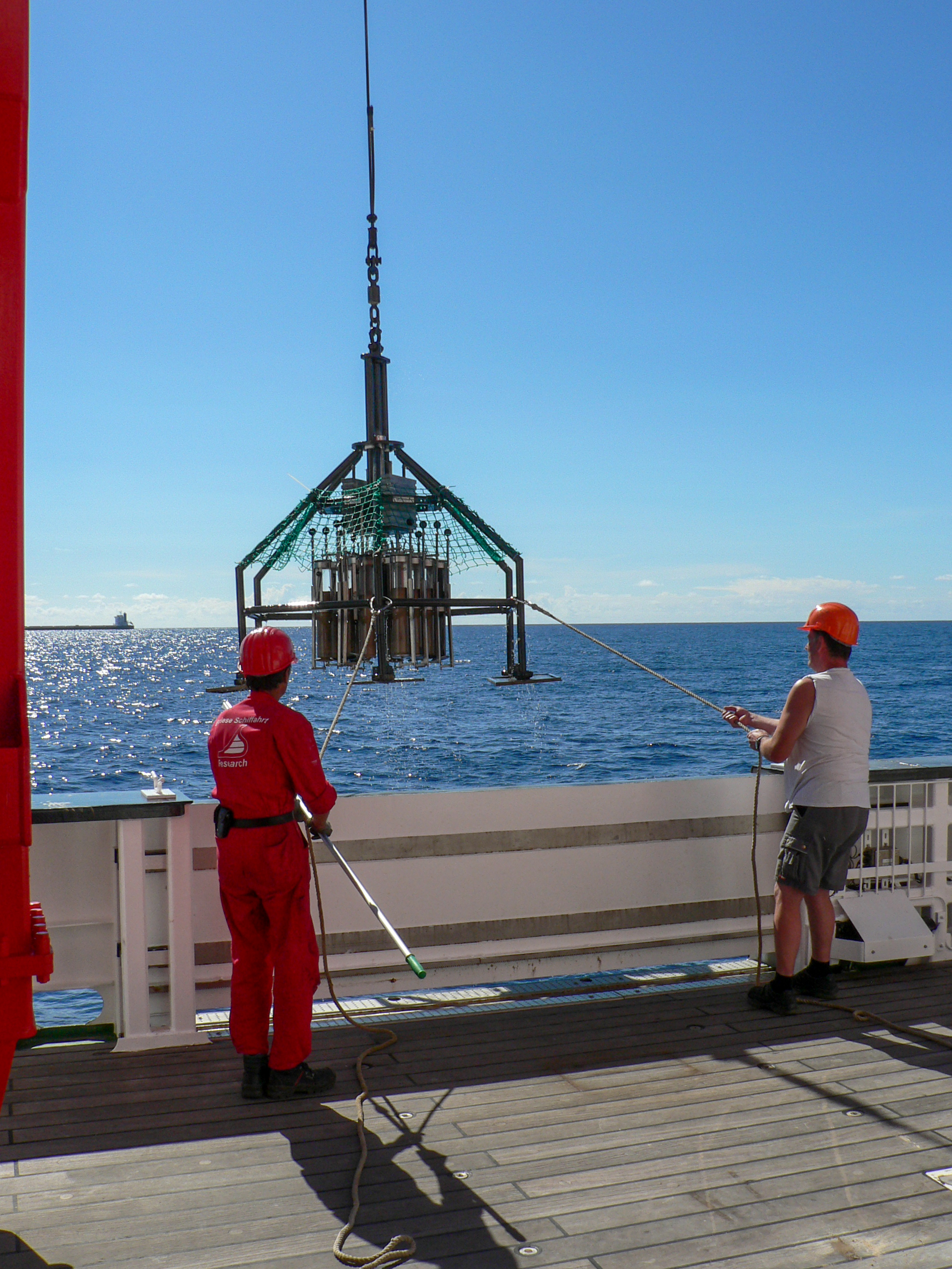Another goal of the expedition is to better understand the cycling of organic matter in the deep ocean water column. The INDICOM project, based in the Marine Biogeochemistry Research Division at GEOMAR led by Professor Dr Anja Engel, is investigating so-called gel particles, which are rich in carbohydrates and proteins and could play an important role in microbial carbon degradation. For this purpose, water samples are collected from different depths of the Indian Ocean using a rosette water sampler to determine biogeochemical and biological parameters such as bacterial activity. This research is crucial for understanding carbon fluxes in the ocean and can help improve climate models.