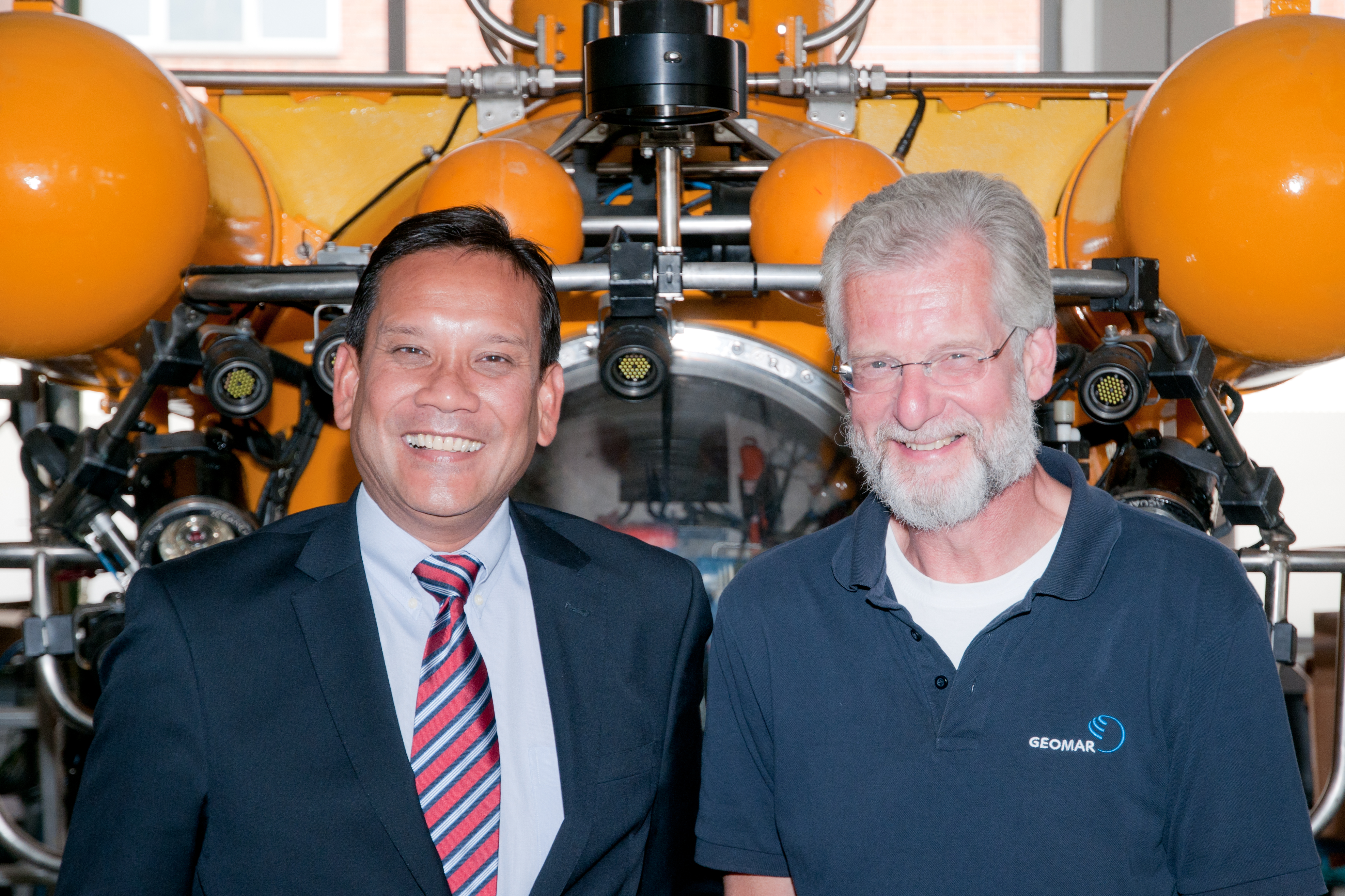 During the one hour conversation, Ambassador Sohan was especially interested in the fields of climate research, climate modeling and sea level rise. "As an island nation with very scarce land resources, Singapore has naturally great interest in new findings in these areas," Professor Herzig said after the meeting. But other issues, such as the research into natural marine substances, were on the agenda as well. During a brief tour, the Ambassador also learned of the maritime technology infrastructure at GEOMAR, such as the submersible JAGO, the ROV fleet and one of the world's largest pools of ocean-bottom seismometers. "Singapore is located right on the border between the Indian and Pacific Ocean. Thus the city-state is an ideal site for many research topics, such as climate research, the study of global water mass transport, as well as ecology in tropical oceans, or raw materials," said Professor Herzig. "So we look forward to establishing good contacts."