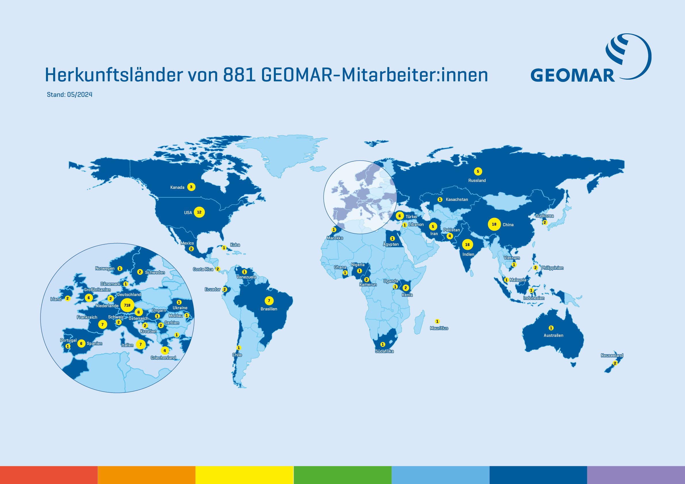 The map shows the many countries of origin of 881 GEOMAR employees. Graphic: Christoph Kersten