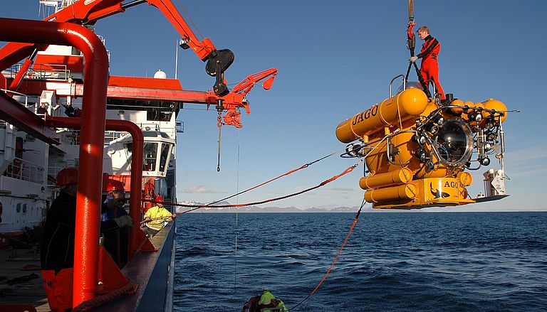 The submersible JAGO and the German research vessel MARIA S. MERIAN off the coast of Spitsbergen. Photo: Karen Hissmann, GEOMAR