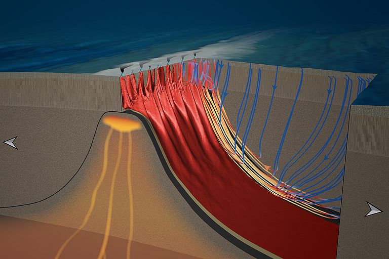 In general, it is well known that seawater penetrates into the Earth's interior through cracks and crevices along the plate boundaries. The seawater is heated by the magma; the hot water rises again, leaches metals and other elements from the ground and is released as a black colored solution. "However, in detail it is somewhat unclear whether the water enters the ocean floor in the immediate vicinity of the vents and flows upward immediately, or whether it travels long distances underground before venting," explains Dr. Jörg Hasenclever from GEOMAR.