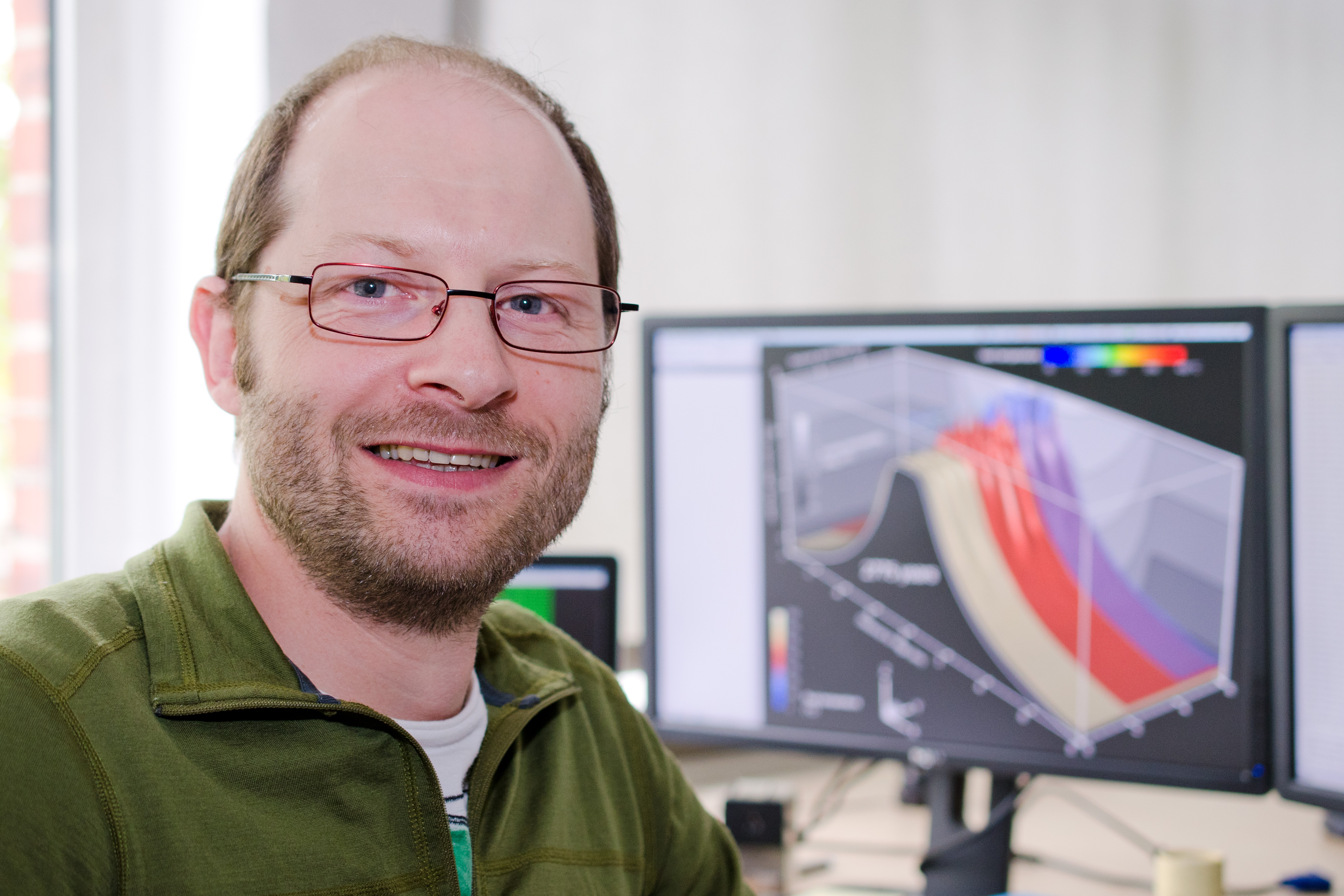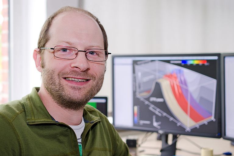 Dr. Jörg Hasenclever in front of a visualization of his computer model. Photo: J. Steffen, GEOMAR