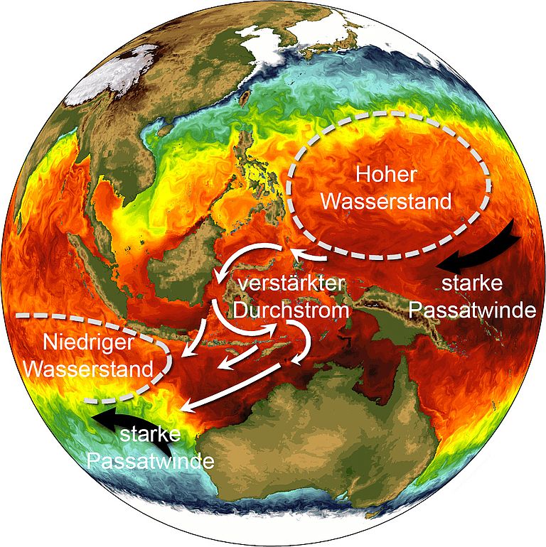 In the Indo-Pacific region the past two decades were characterized by enhanced “La Niña-like” conditions with cold waters in the Eastern Pacific and warm waters in the Western Pacific. Driven by the enhanced trade wind system, warm water was moved westward by the Indonesian throughflow into the Indian Ocean. Finally, about 70% of the global heat uptake is stored in the upper 700 metres of the Indian Ocean.