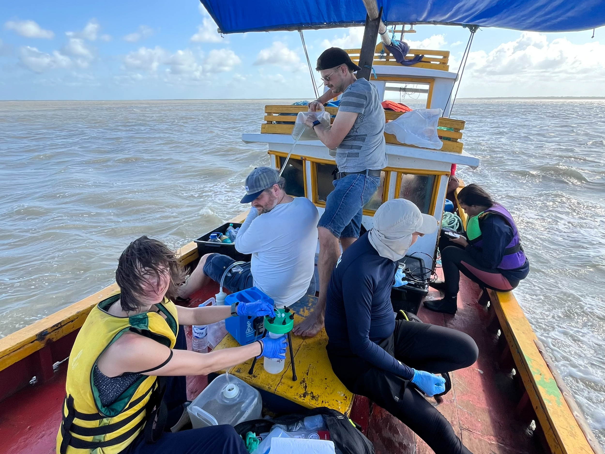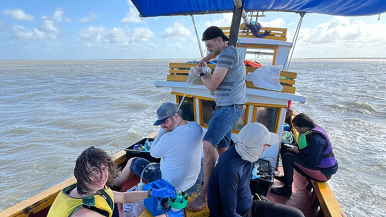 Water sampling at the mouth of the Caeté River estuary which is surrounded by mangrove forests, using a small local fishing boat. From left to right: Dr. Sandra Pöhle (Constructor University Bremen), Dr. Ed Hathorne (GEOMAR Kiel), Dr. Nico Mitschke (University of Oldenburg), Prof. Thorsten Dittmar (University of Oldenburg), and Karolayne Antonia Fonseca da Silva (Federal University of Para). These filtered samples will be analyzed for dissolved organic matter, trace metals, and isotopes to explore how mangrove systems affect the cycling of organic and inorganic materials in these regions. Photo: Adrienne Hollister
