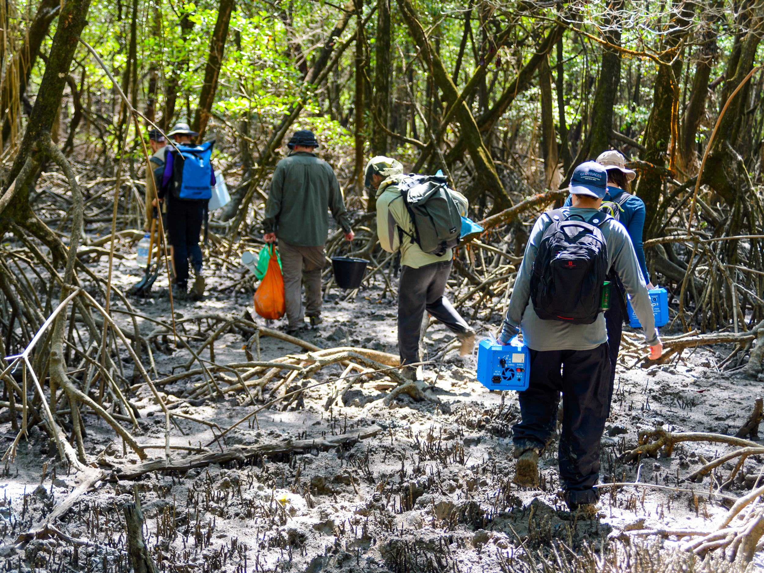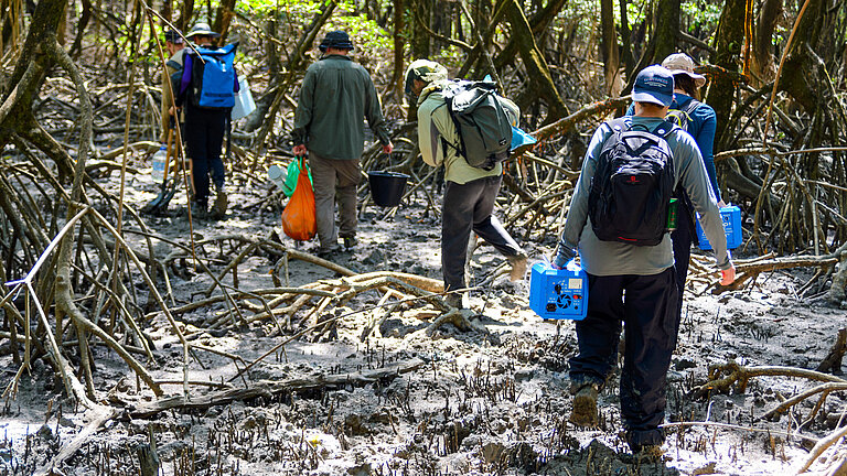 Scientists from GEOMAR, Constructor University Bremen, and the University of Oldenburg navigate through the mud, crab burrows and roots of the mangrove forest carrying the equipment needed to collect groundwater, porewater, and sediment samples to explore the complex geochemical processes occurring in this unique ecosystem. Photo: Nico Fröhberg