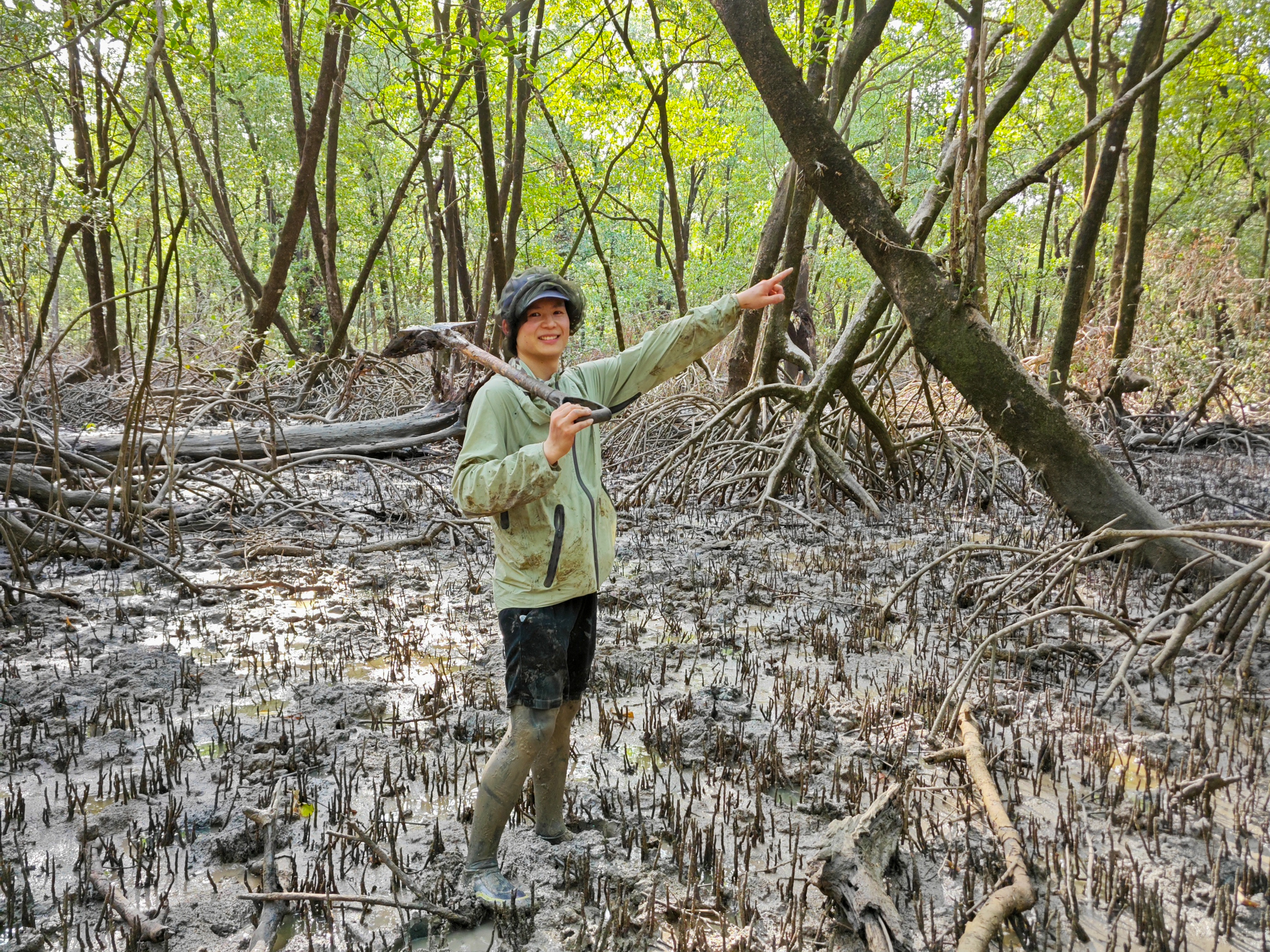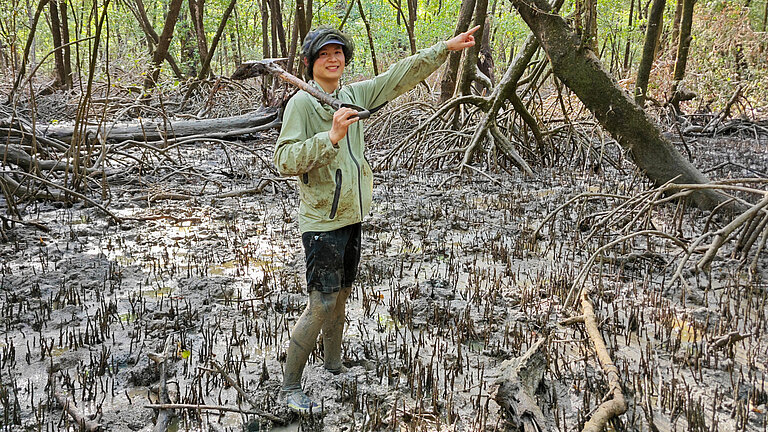 Dr. Antao Xu from GEOMAR is captured carefully selecting the best location to gather groundwater samples in the mangroves, working swiftly to beat the approaching high tide. Photo: Jakob Weik
