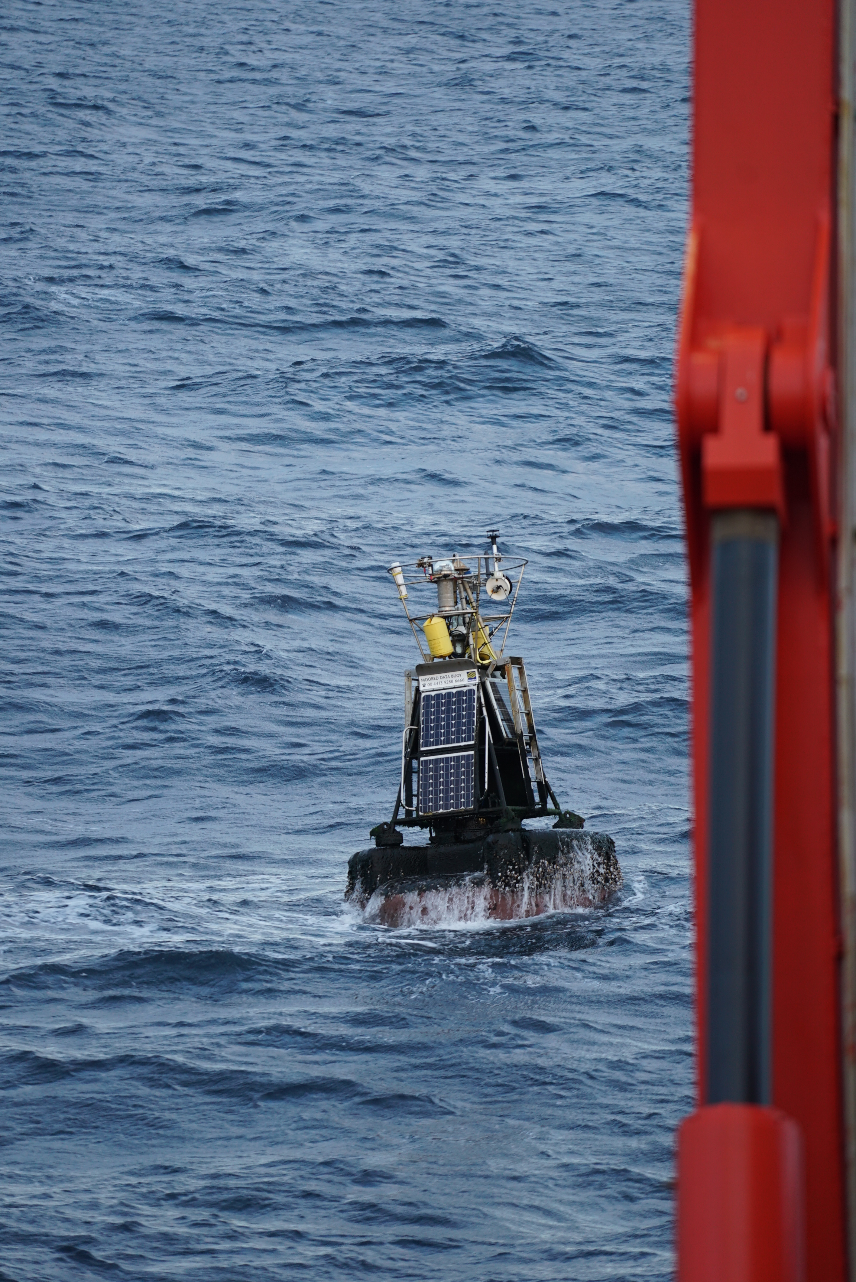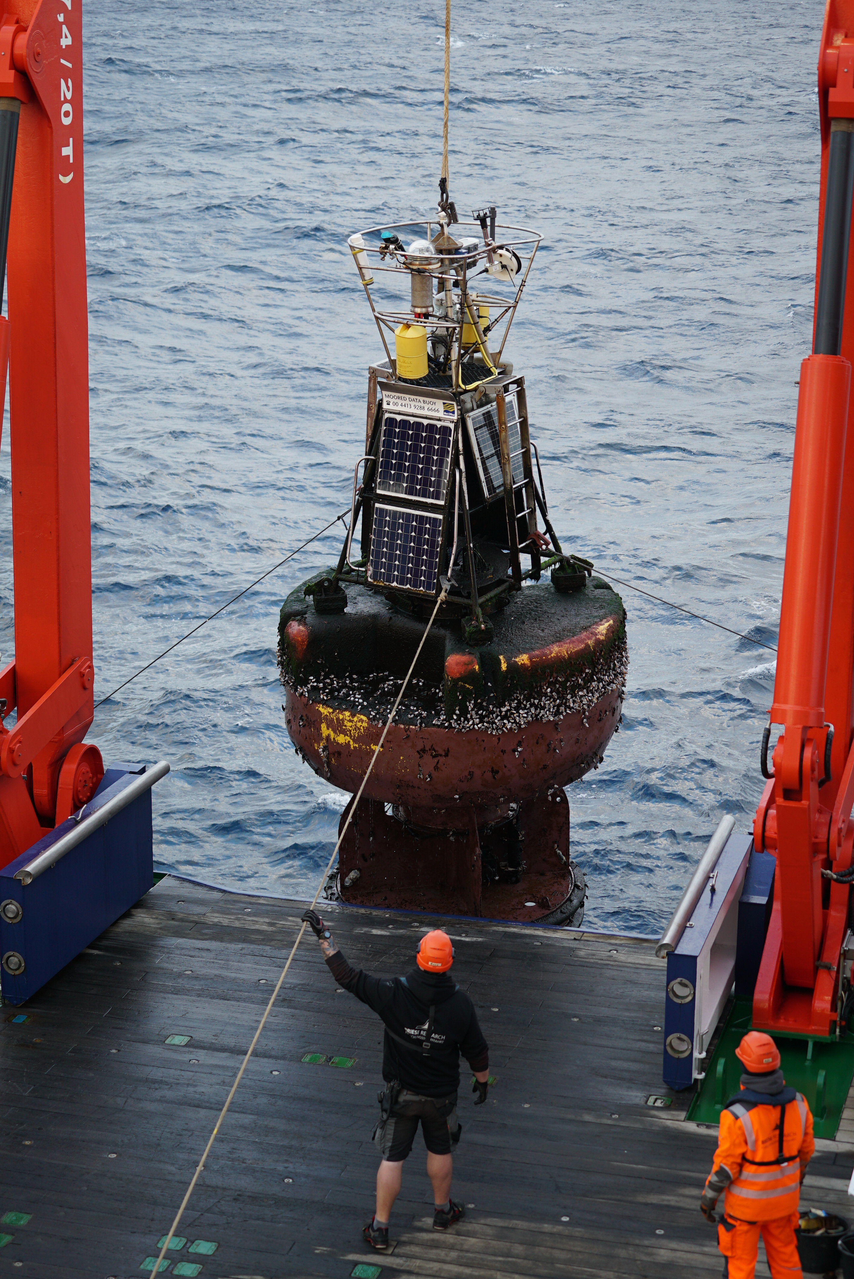 6 November 2020/Northatlantic/Kiel. Actually, the goal of the expedition MSM96 of the German research vessel MARIA S. Merian was to precisely map and investigate parts of the seafloor in the central Atlantic. But yesterday the scientific voyage turned for a short time into a salvage mission. The crew of MARIA S. MERIAN pulled a six meter long buoy out of the sea, which had been drifting uncontrolled southwest of Ireland for several days. It was part of the "Porcupine Abyssal Plain Observatory" (PAP), an oceanographic long-term observation station of the British National Oceanography Centre. End of October a massive storm with waves more than twenty meters high had torn the buoy from the mooring cable. Since the area was on the route of RV MARIA S. MERIAN and the crew has experience with such large oceanographic equipment, the German research vessel took over the recovery.