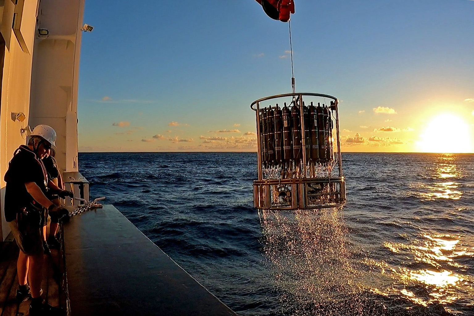 A rosette water sampler with water samples is brought back on board the German research vessel SONNE on expedition SO289 in the South Pacific.