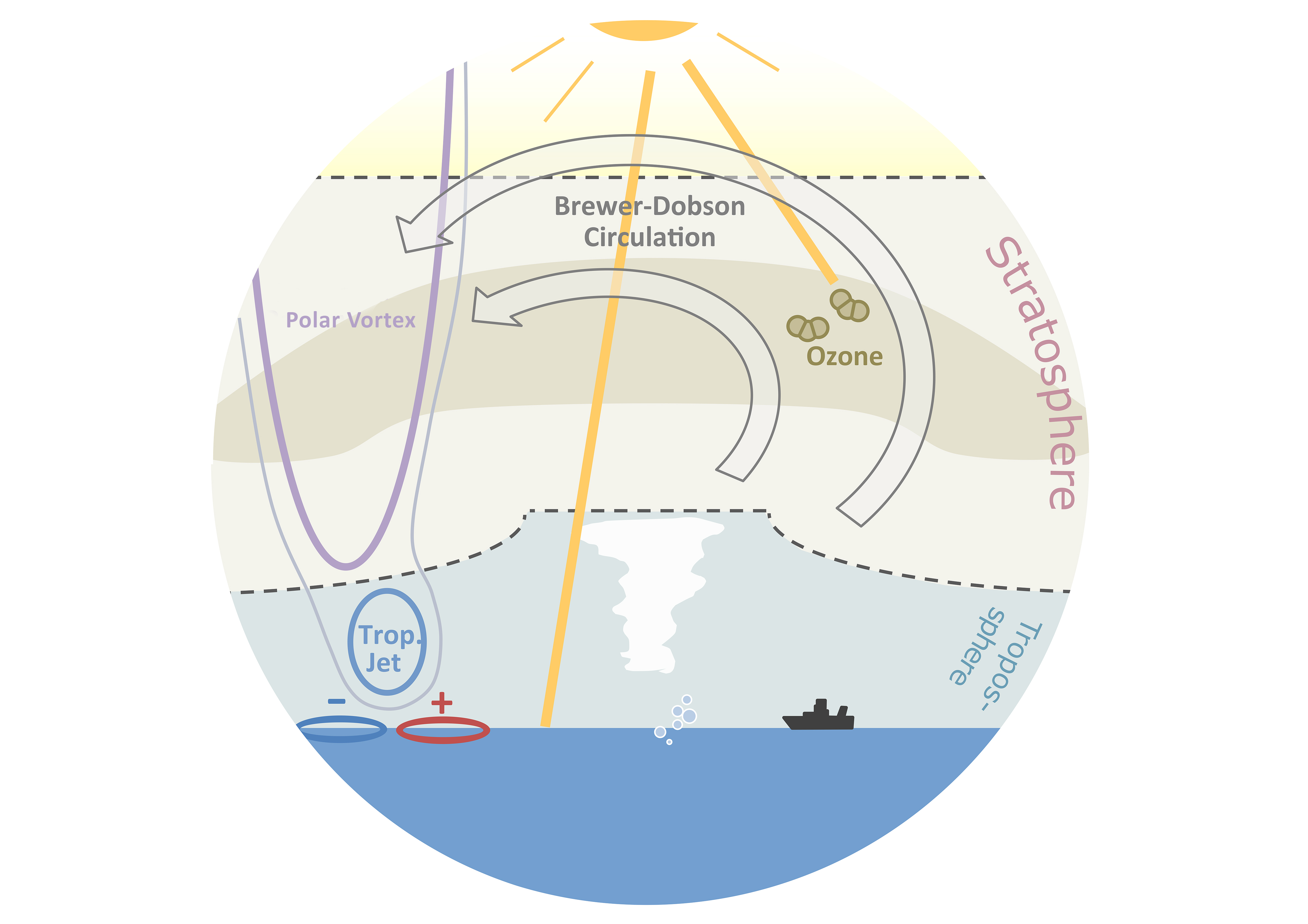 Although the stratosphere is located at an altitude of ten to 50 kilometers, it does directly or indirectly influence life on the Earth's surface. Extreme events in the stratosphere can, for example, extend into the lower layers of the atmosphere and influence the daily weather there. The stratosphere is also home to the ozone layer, which is known above all for providing protection against harmful UV radiation from space. Less well known, but no less significant, is the fact that the ozone in the stratosphere also has an influence on the dynamics in the atmosphere. Fluctuations in ozone concentrations, for example, can influence the position of the so-called jet stream. Thus, they also affect temperatures on the earth's surface and ocean currents.