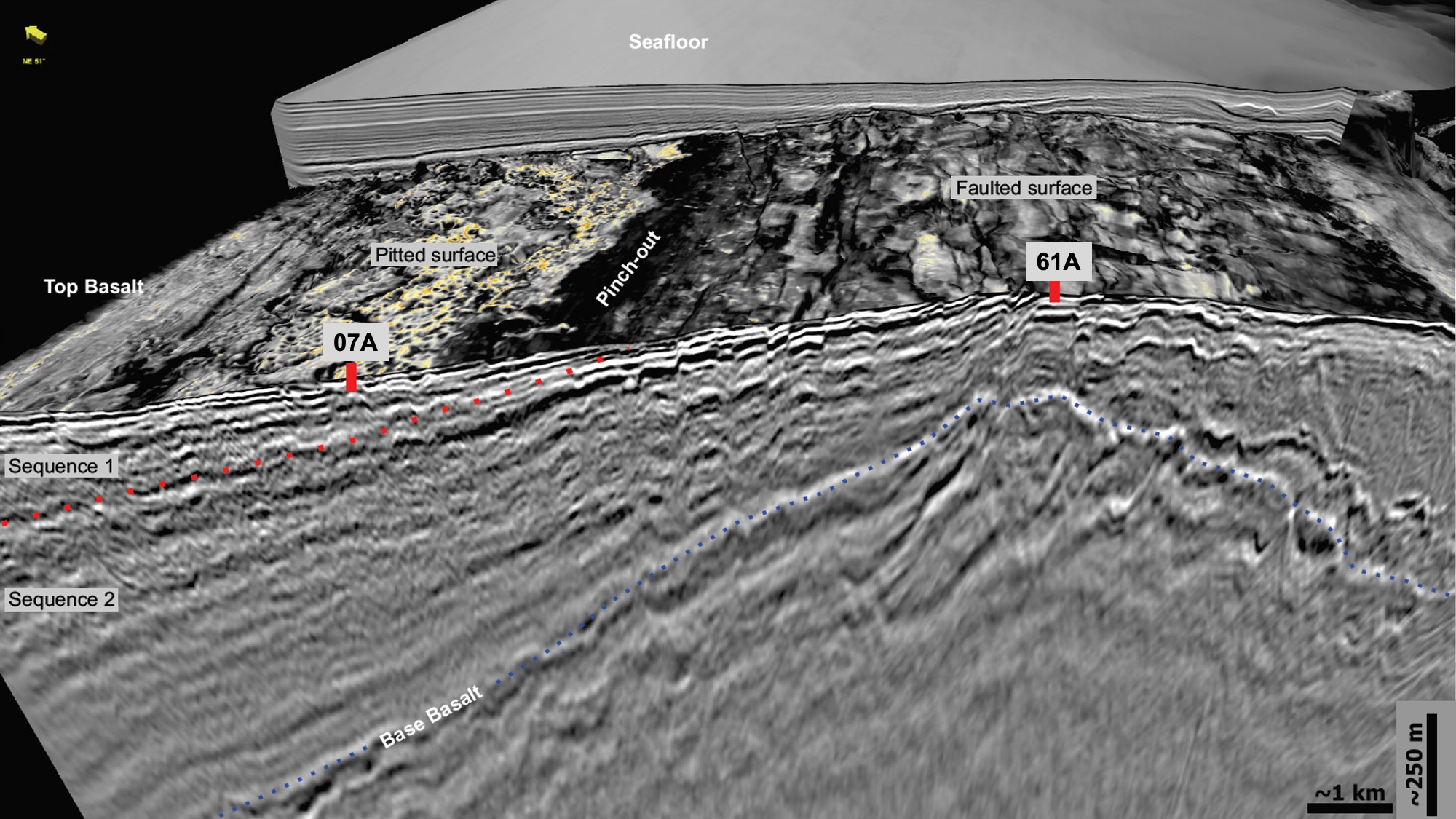Three-dimensional section through the Skoll High basalt complex in the Vøring Plateau off the coast of Norway showing test drillings (07A and 61A) from 2022. Graphic: VBER