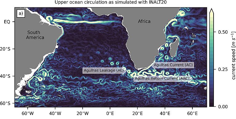 The Agulhas Current transports warm and salty water from the Indian Ocean southward along the east coast of Africa and forms a retroflection at the southern tip of Africa. From this retroflection, part of the current leaks – among others in the form of oceanic eddies – into the South Atlantic and forms the so-called Agulhas leakage. Through its properties, Agulhas leakage affects the large-scale ocean circulation and global climate, but is also itself influenced by human-induced climate change. Scientists expect that the increase in westerly winds in the southern hemisphere caused by climate change will increase the Agulhas inflow, resulting in increased salt transport into the South Atlantic. This process could counteract the projected weakening of the Atlantic Meridional Overturning Circulation (AMOC) – also called the Gulf Stream system – due to warming and melting of the Greenland ice sheet.
