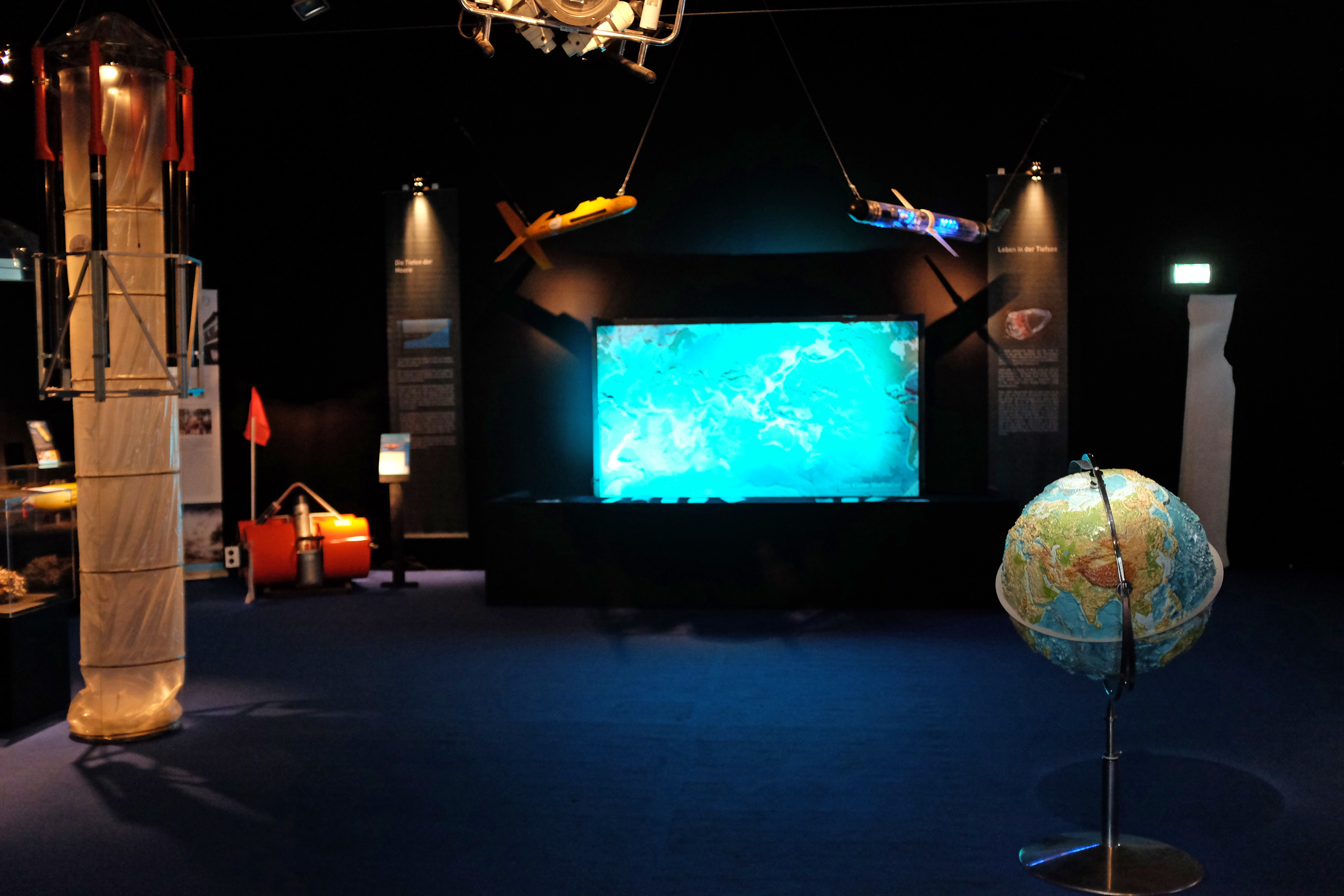 from the sea floor, such as a piece of lava from a water depth of several thousand meters, convey a direct image of the fascinating and foreign world of the deep sea to the visitors. Research equimpment in original size and as models gives an impression of the great technical effort necessary to explore the largest habitat on earth.