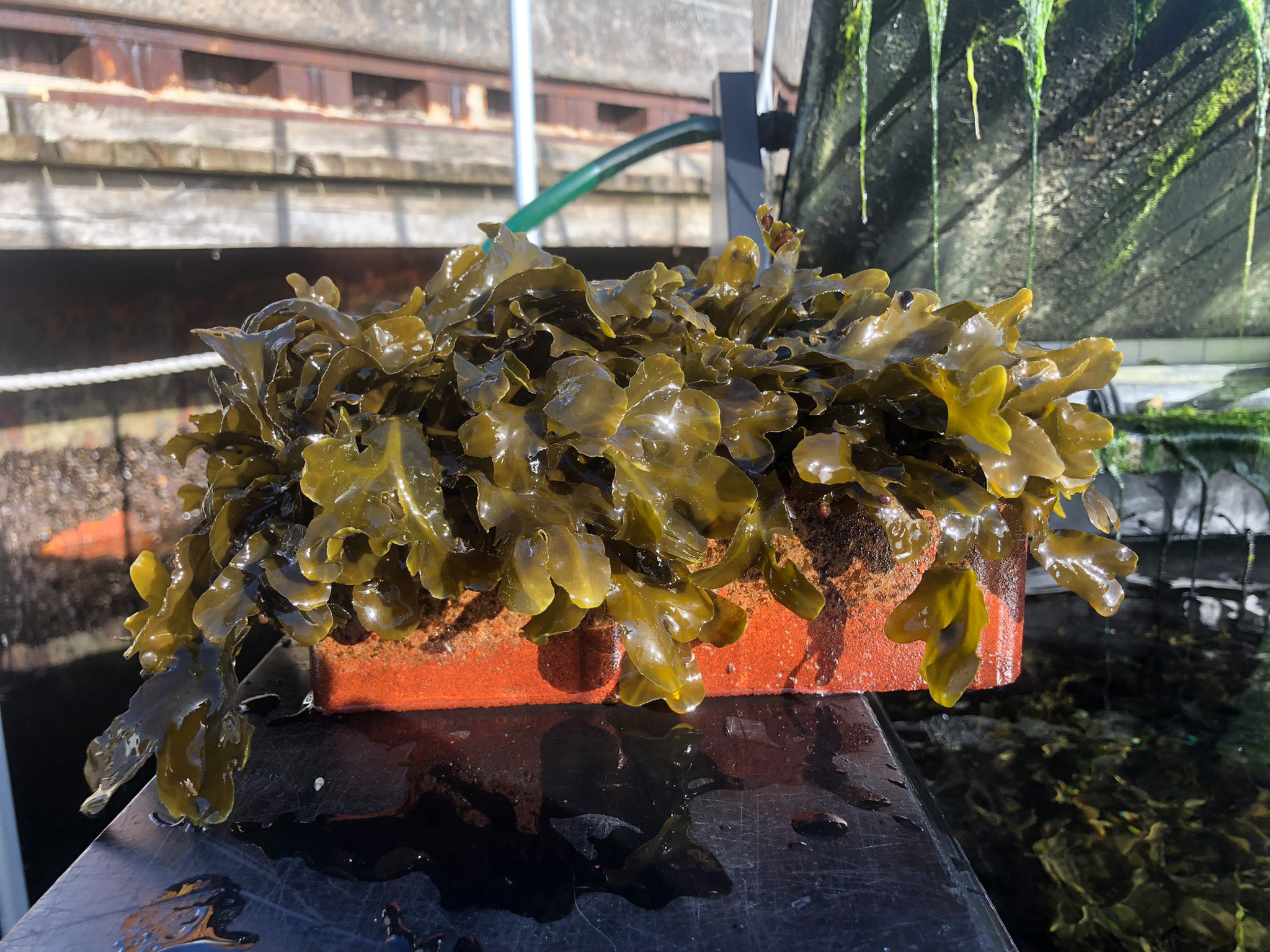 Successful cultivation of bladderwrack on a brick in a GEOMAR field test facility. Photo: Martin Wahl / GEOMAR