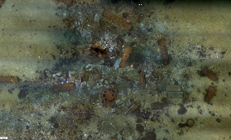 Photo mosaic with old munitions on the sea floor, taken during the AL548 expedition with the help of the AUVs ANTON and LUISE. Photo: AUV team GEOMAR