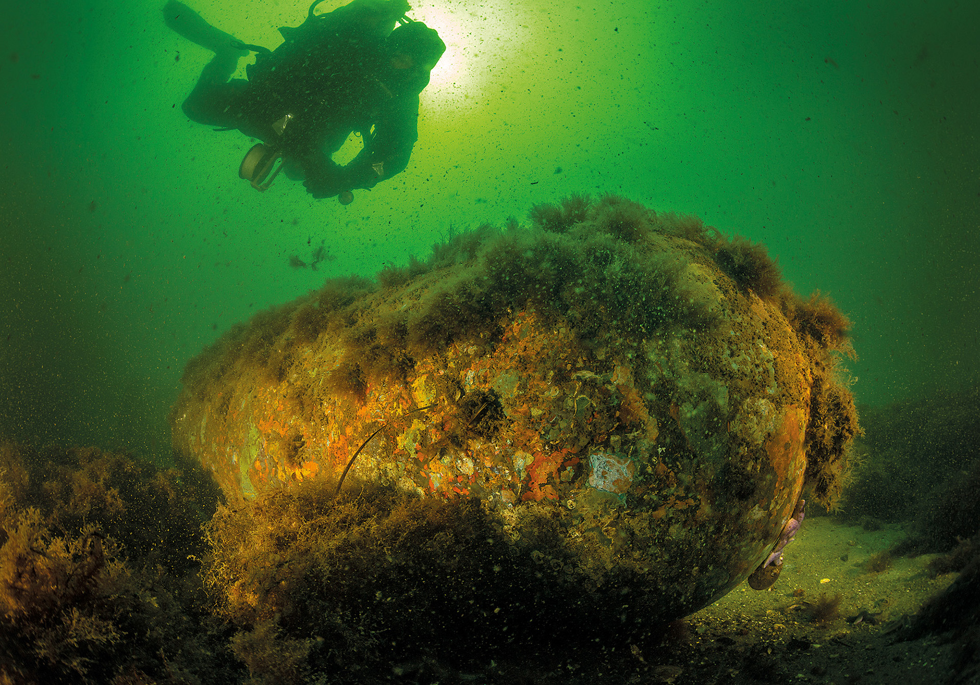 A research diver examines a sea mine from the Second World War in the Kolberger Heide munitions dumping area in the Kiel Outer Fjord. Photo: Christian Howe, www.h2owe.de