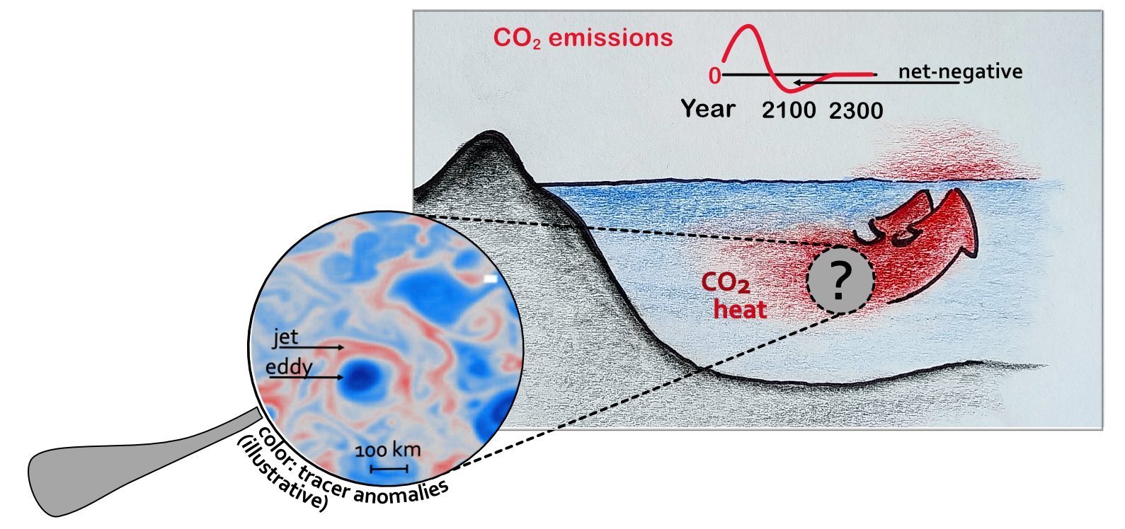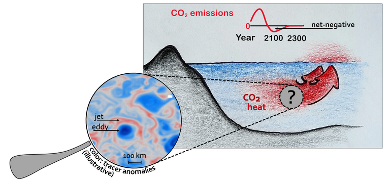 "This is basic research," says Frenger, "we need to understand the processes in order to assess the consequences of our interventions, such as a strong active removal of carbon dioxide from the atmosphere." Her research question addresses for the first time both carbon dioxide (CO2) and heat, tracking how they behave under such conditions, and which processes in the ocean are the most important, in particular the role of transport and mixing by eddies. "About 40 per cent of fossil fuel emissions and 90 per cent of heat have been absorbed by the ocean. Now we have a political goal to stop emissions or even, if we miss our climate target, to remove CO2 from the atmosphere in the second half of this century. What is the fate of the CO2 and heat that the ocean has absorbed?"