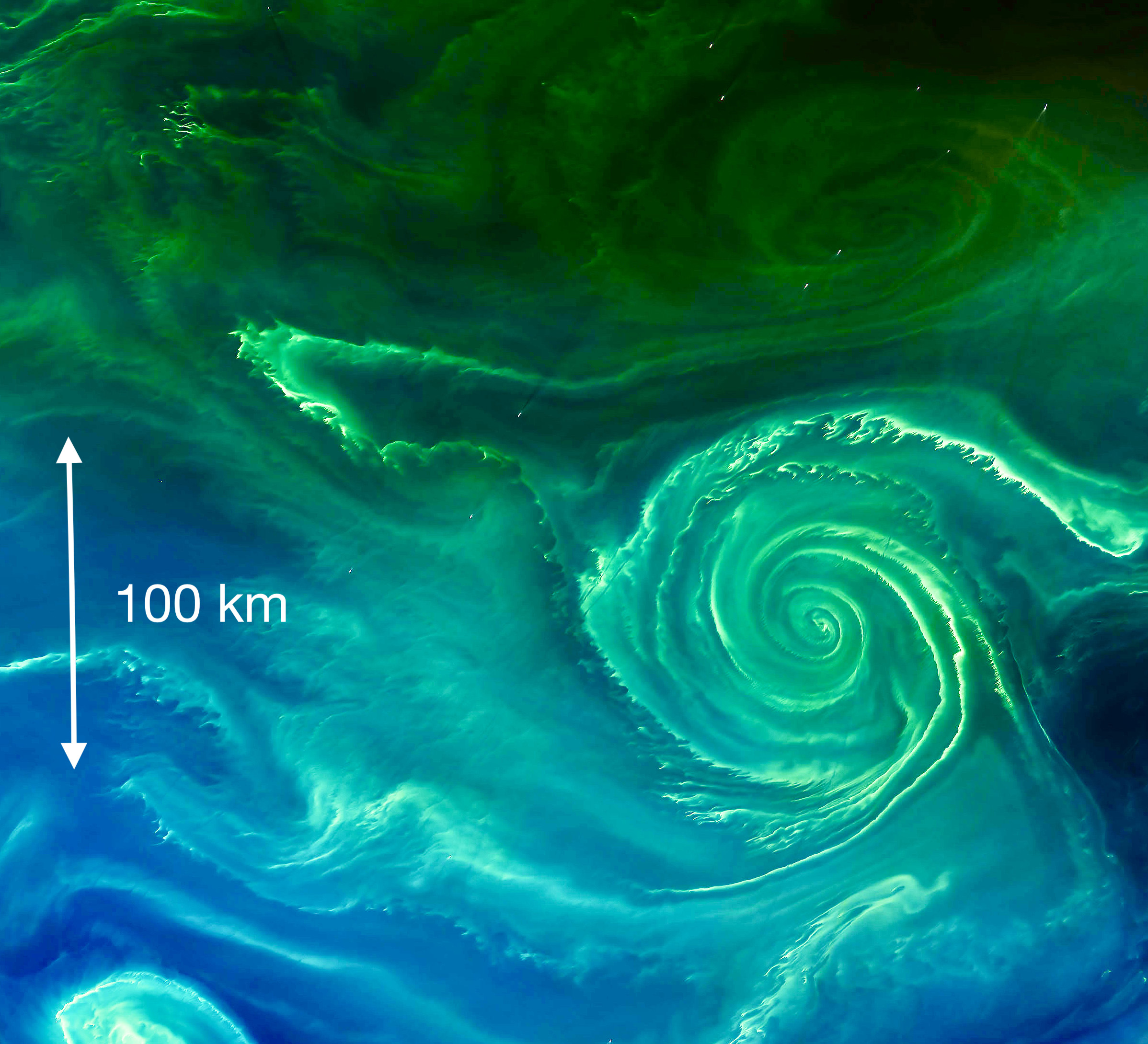 Phytoplankton blooms observed by the Aqua MODIS and Landsat 8 OLI satellites on July 23, 2018. Credit: NASA
