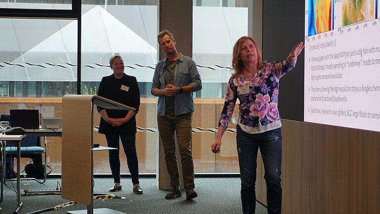 The leading scientists Sarah Fawcett, Seb Swart and Sabrina Speich (from left to right) present WHIRLS at the kick-off event for the interdisciplinary ERC Synergy Grant Project. Photo: Markus Scheinert, GEOMAR