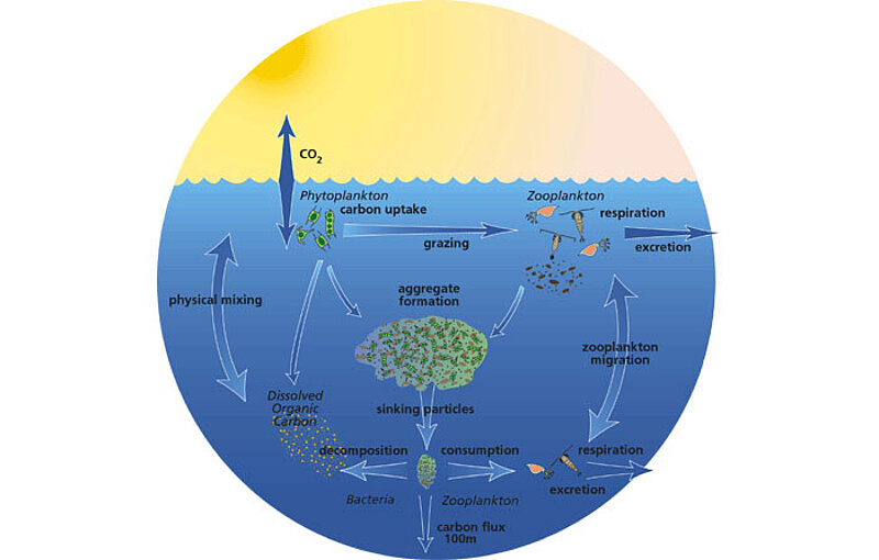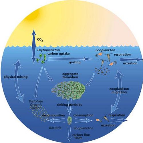The biological pump is an ecosystem service that influences atmospheric CO2 concentration by transporting dissolved and particulate biogenic elements (C:N:P) into the ocean’s interior (Figure 1). Without, the biological carbon pump (BCP), the atmospheric CO2 concentration would be twice as high as the current concentration. Current assessments of the global strength of the BCP vary widely (5-20 GtC yr-1). Both, uncertainties associated to its temporal/spatial dynamic and to its mechanistic representation in numerical models prevent any better estimate. Consequently, making predictions on the BCP with respect to warming, increasing stratification, acidification and anoxia, is presently equivocal.