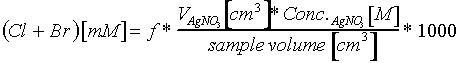 Calibration is made with IAPSO standard seawater . IAPSO is titrated in the same way as the sample. The f-factor is determined as ratio of the theoretical AgNO3 consumption (Vt = 0.557 cm3 for IAPSO with a salinity of 34.998) and the practical consumption (Vp) determined via titration of the IAPSO standard.