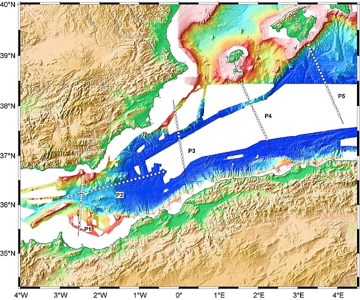 The Western Mediterranean is a natural laboratory to study the processes of continental extension and rifting in a convergent setting. Gravitational collapse due to tectonic thickening of continental lithosphere and the rollback of an oceanic slab during the latest phases of consumption of the Tethys oceanic lithosphere have led to rapid Neogene extension in an area characterized by a constant convergence of the African and European Plates since Cretaceous time. The current setting displays a complex array of tectonic units that may be characteristic of the stage previous to a large scale continent-continent collision and that may include the lithospheric terranes that will eventually be emplaced along an orogenic belt. However, little is known about the crustal and upper mantle structure of much of the area and about the mechanisms of extension that have controlled the formation of the continental margins. Scientists believe, though, that the Ligurian Sea and the deep sea basin to the south of the Balearic Islands (Algerian Basin) is either floored by Neogene oceanic crust or perhaps by exhumed continental mantle, while the Alboran Sea and the transition from the south-Balearic margin into the basins are suggested to be characterized by streched continental crust. The understanding of the formation mechanisms and the evolution of the continental margins of the Western Mediterranean has been hampered by the lack of modern geophysical data. During M69/2 two seismic refraction and wide-angle profiles were acquired between Spain and Morocco to study the structure of the Alboran Sea and the transition from the Alboran Sea into the adjacent eastern basin of unknown nature. Three additional lines while run from the Spanish coast and from the Balearic Islands into the Algerian Basin. Shots from four of the five lines were received not only on seismic receivers deployed on the seafloor but also on seismic landstations.