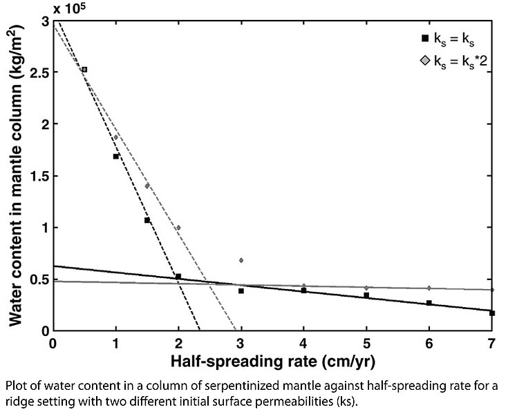 - The average water content of the mantle is a strong function of spreading rate. We find two distinct trends: slow spreading ridges show high degrees of hydration that rapidly drop with increasing rate. Fast spreading ridges show only limited water contents which do not greatly depend on the spreading rate.