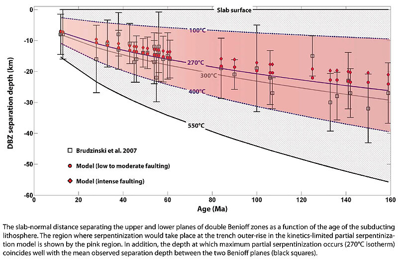 - the observed spacing of double Benioff zones is consistent with the temperature dependence of serpentinization reaction kinetics, i.e., the average depth of the second seismic zone correlates to the depth of maximum serpentinization prior to subduction