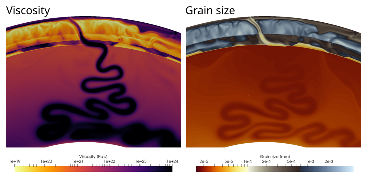 The image shows how the mineral grain size affects the viscosity in and around subducted slabs in a global convection model. Changes in viscosity due to grain size variations are comparable to the ones caused by temperature.