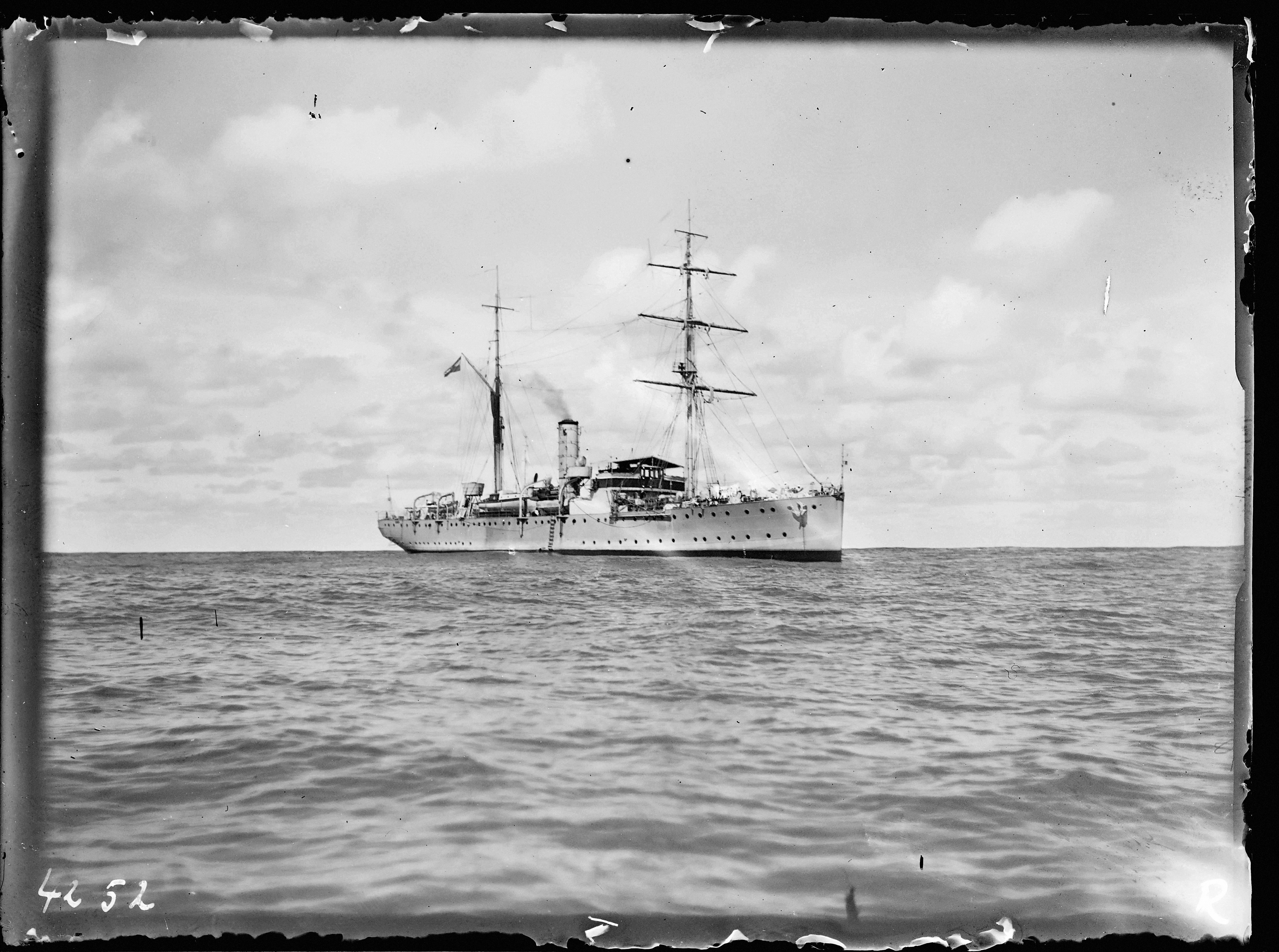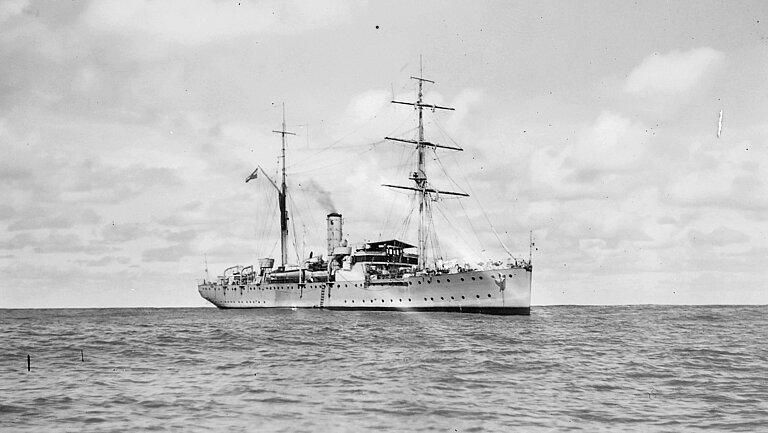 Research vessel METEOR I diagonally from the front, photographed in 1926 during the German Atlantic Expedition. Collection of the German Maritime Museum. Photo: Otto Freiherr von Recum