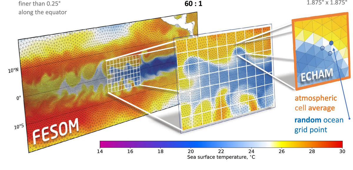 We use novel diagnostic methods to analyze the scale distribution of the atmosphere-ocean fluxes in high resolution climate models. This will shed light on the scales at which the ocean is driving the atmosphere and vice versa. It will also help us to develop new stochastic atmosphere-ocean coupling parameterizations. The focus is on global climate models AWI-CM3 and ICON.