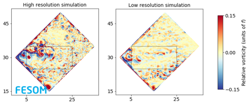 Idealized double gyre setting for parameterization development at different resolutions. Shown is surface relative vorticity at (left) 10km and 20km (right) resolution, illustrating the change in mean current and variability in this configuration with constant wind and air temperature forcing, representative for the North Atlantic.